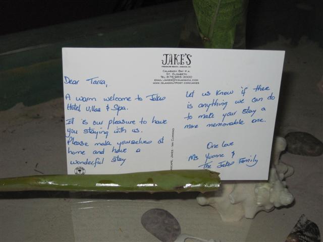 When I arrived at Jake's and walked past the car (pic later in the posts) with the ladies in the back I had to smile......easy check in and off to the private cottage by the sea. Jack Sprat is a two bedroom stand alone VERY private cottage with two porches (one facing the little beach at Jack Sprat Rest. and one facing the sea), no TV but big screen w/DVD player, full kitchen and HUGE yard w/soft grass and a pavillion by the sea too. at the corner of the yard is the gate to Sprats which was so convenient. And its away from all the other rooms, cottages, etc. Loved it. The coffee table .....glass top filled with sand and shells inside ....gotta copy that idea....but there was a beautiful postcard personalized for me - nice touch. the patio had branches as the roof and was so cool. flowers everywhere.