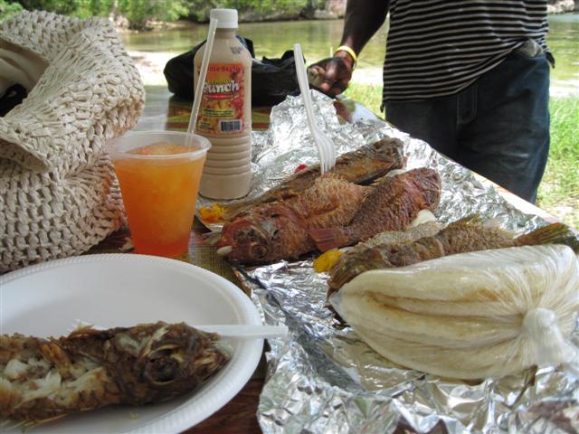 The spot is lovely and they were so sweet....they got a wood table and put it in the shade for us and brought us seats so we could chill and enjoy the food. It was sensory overload. The cook showed me a tray of escovitch fish and my mouth was watering ..... I said give me them ALL (probably 10 or 12 whole fish) plus soft fresh bammy (for those that haven't tried it - its like a white cornmeal dough in shape of thick tortilla, spongy, chewy, delicious). Plus they had PEPPA SHRIMP another first for me but saved it for Negril cuz I was stuffed quickly on fish and bammy (one shrimp was the size of a small lobsta). Also got some corn on the cob for later too.