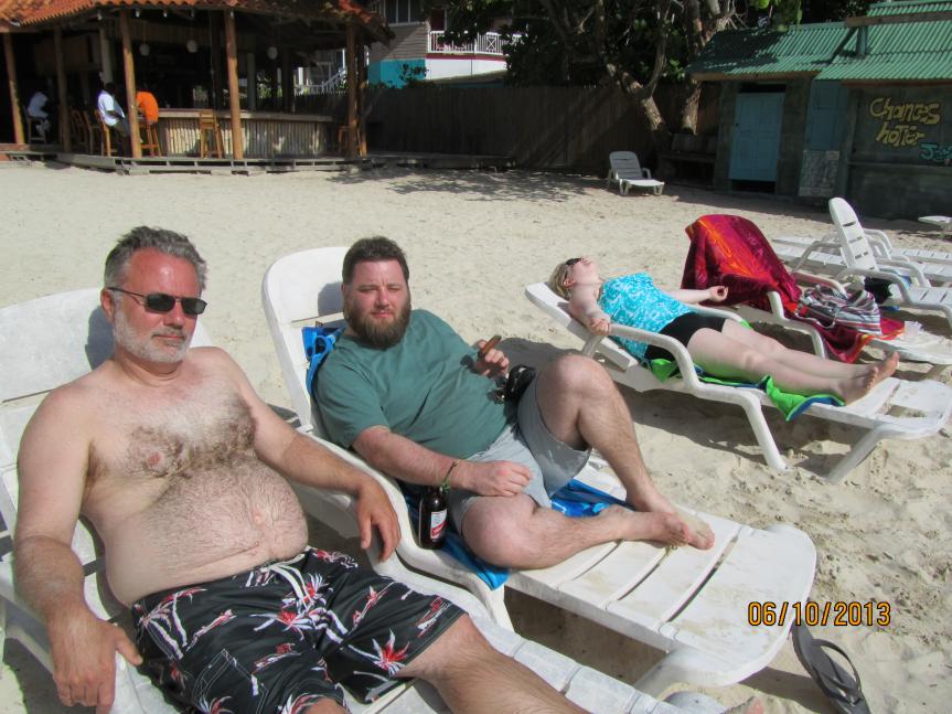 Pretty much did the same thing as the previous day. Ate breakfast, took a nap in the hammock, swam in the pool, then went to the beach. Went to Idle Awhile because we were told they have really good dirty bananas. My wife and mother said the dirty bananas were great. My dad on the other hand kept ordering the casadias because the paddie man wasn't on the beach. Headed back to the west end to get dressed because we were going to Eddie Debar's. My father got a taste of good jerk at Eddies. Pam, Eddies wife was in town, so we got to talk with her about things we were doing. Nicole, who owns Bananas Garden was at eddies also, so we all had a good time.