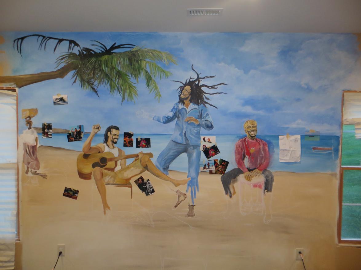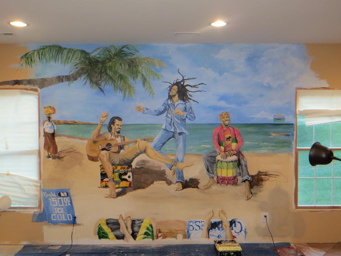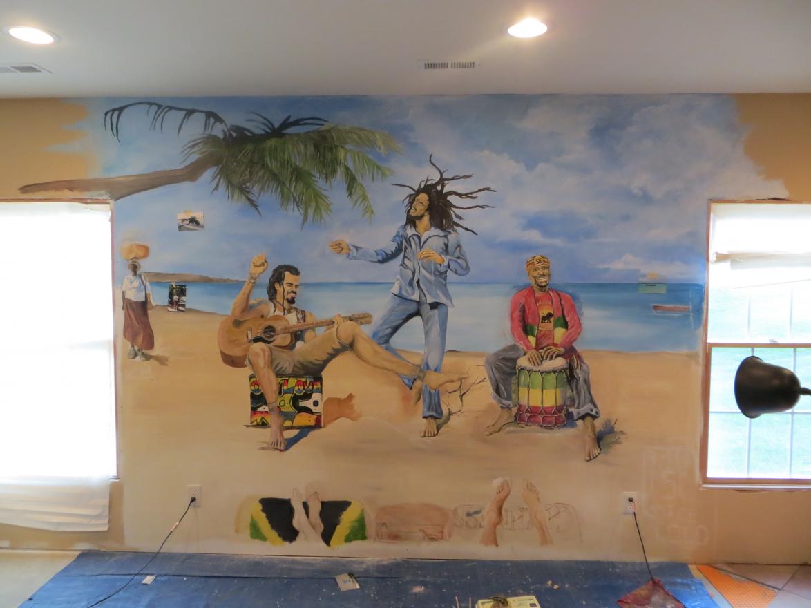 We decided to bring part of Negril to us. We commissioned a mural on our wall in our basement that we are currently finishing. Here are some pics along the way. This is a way to keep us in the Negril Spirit when travel to Negril cannot occur. Hope you enjoy the shots (sorry Rob, not totally Negril travel related, but I thought folks here would get a kick out of it).