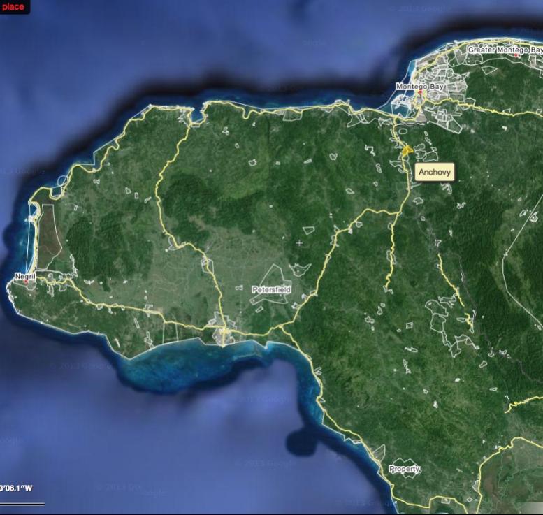 There are really on two good roads to get there. The coast road to Mobay or go straight thru Sav-La-Mar and make a left thru Petersfield. (that road doesn't show on this map)