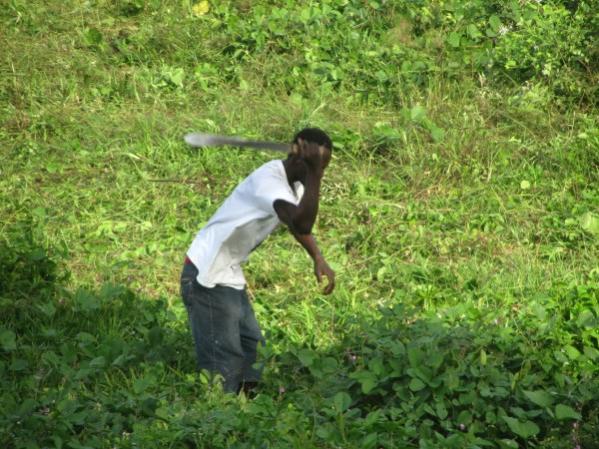 Worker next to Blue Cave Castle cutting back the brush