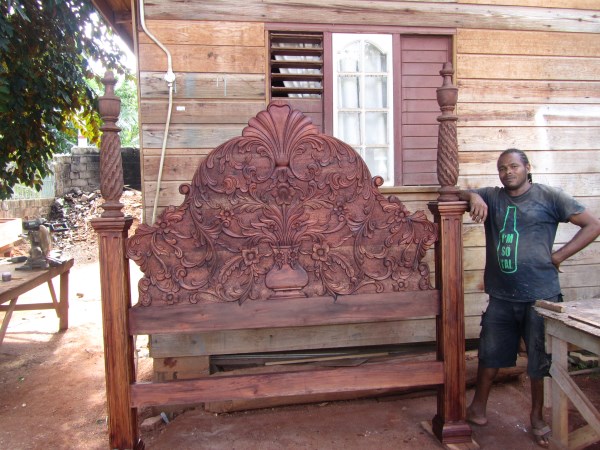 This is the headboard that I showed a few days ago. They had just put on the stain. I asked the price and they quoted $1400 US and that they could ship it to the US. They said in a day or two they would spray on the finish. The fellow in the photo was the craftsman. The place is across the street and up a hundred yards from Ragabones (Red Dragon)