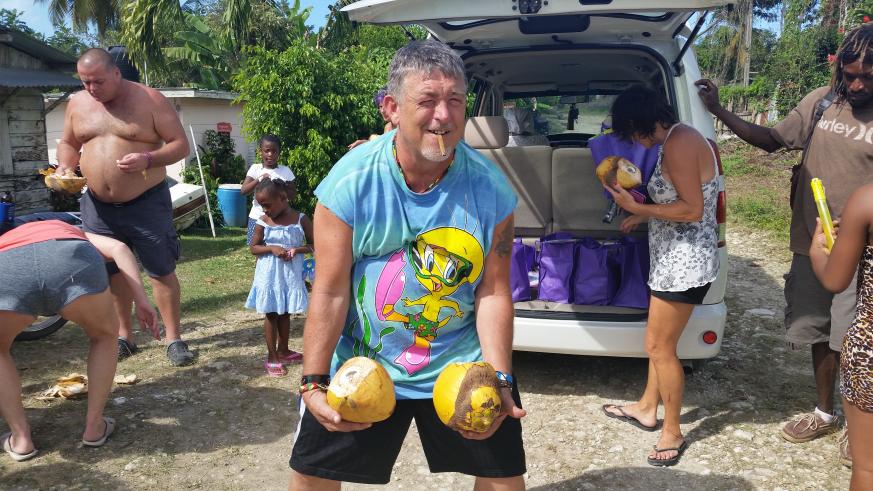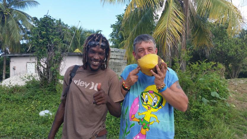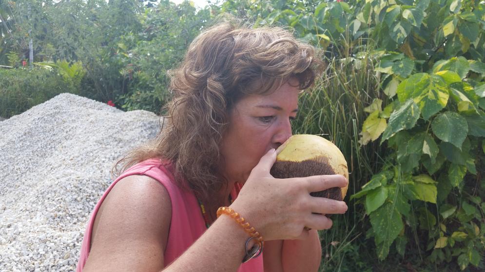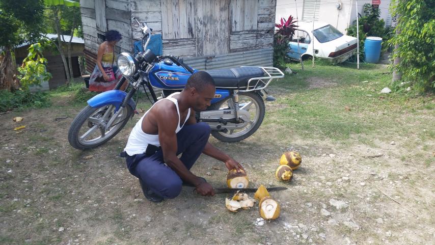 the next stop was at Dwaynes moms neighborhood...Dwayne sent someone for fresh coconuts, which he fixed up for refreshing water for us....