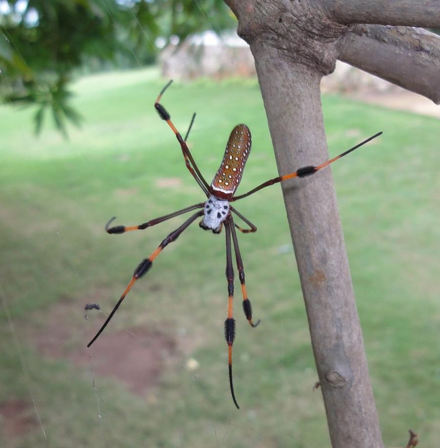 Here's another instance where I wish I'd had a good camera. This beautiful spider hangs out in a mango tree in the yard. Apparently, I'm told, it is poisonous. Look at the tufts of bristles at the joints in its legs. It's body is about 2 inches long.