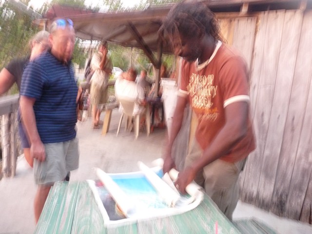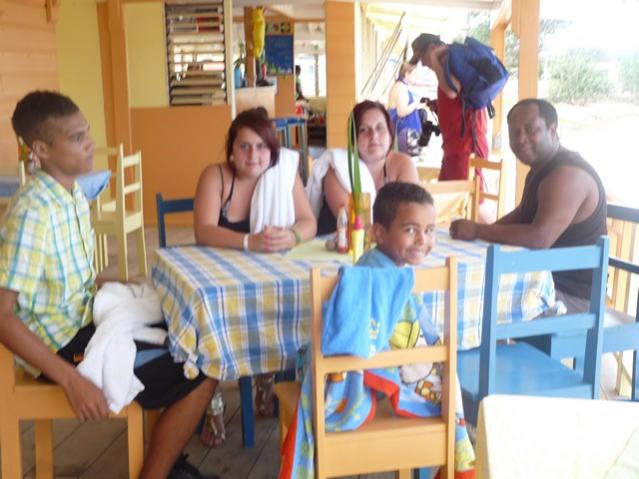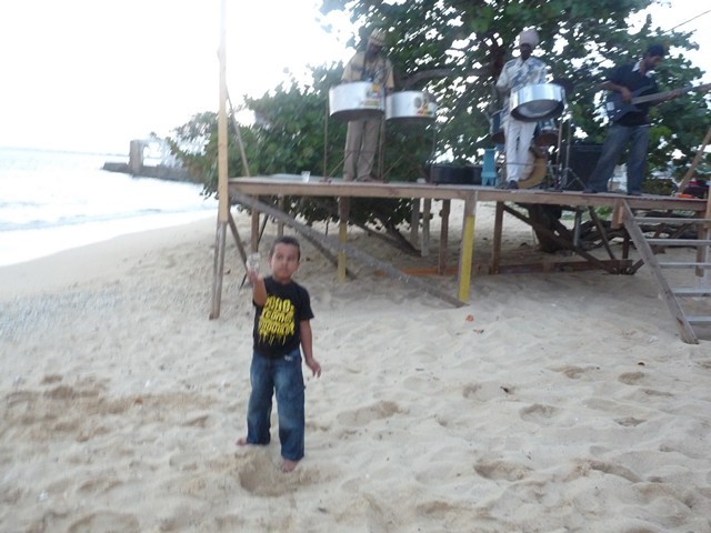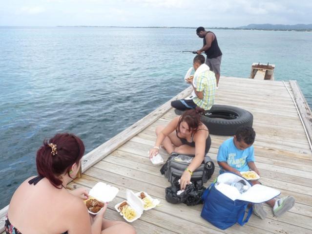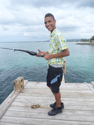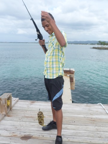 so got the kids a soda at canoe then we walked down to near the roundabout for some food , came back and got our fishing rods out.We have fished only once before and caught a couple of small fish not much was in the ocean where we last fished it seemed empty so we thought we would do great in Jamaica we always see a lot of fisherman with great catches so we all headed to the pier the walkway thing in front of canoe ate our food there and TRIED to fish.We had Clarols son with us from seastar and he said he could fish so he fished and actually caught one, he was the only person to catch anything we tried for hours,we could see lots of small fish but apparently our hooks are too large for them so we need to buy some smaller ones.He caught a puffer fish I think it is called.So I asked Kirby could it be eaten but never shown him it and he said yes pick out the bones/spikes and steam it. So after our epic fail of an attempt to feed my family on our catches of the day we packed up our things the puffa fish included to take back to Clarol!She laughed at it and said it was too small and everyone was laughing at my GIFT i brought for her LOL she said it was still alive but none of us knew how to kill it she said she wanted to put it back in the water I am too afraid to ask the outcome of the fish!
