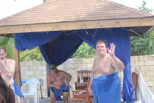 Since it was windy on the beach with little waves, I figured it might be nicer and more calm up past the beaches, past the RIUs, all the way to Rhodes Resort. We made it there in about 15 minutes, and we brought along our rafts to float around. Everywhere we go, SuzieQ gets lots of attention from the Rastas, and at Rhodes the security guards were very attentive -- so much so, that SuzieQ even bought a little piece of jewelry from one of them (she is too nice to say NO!).