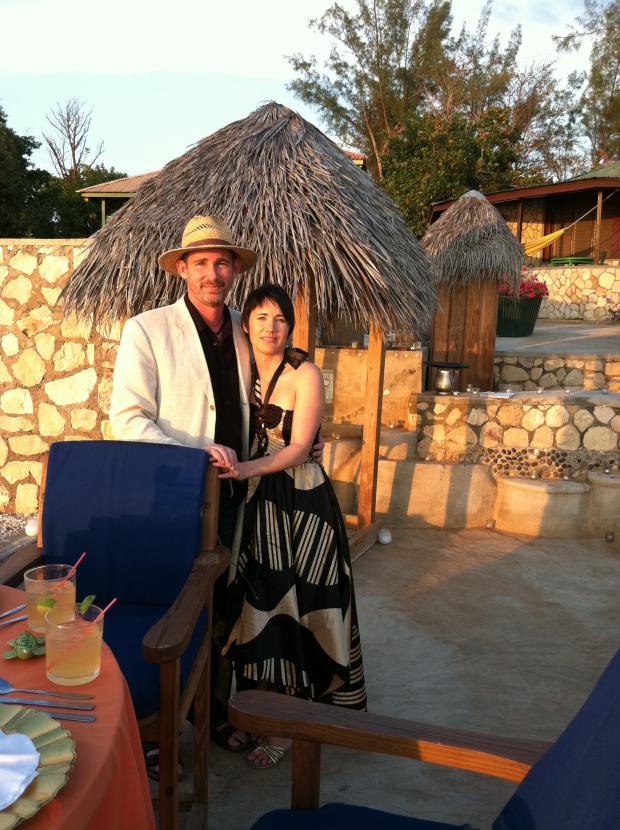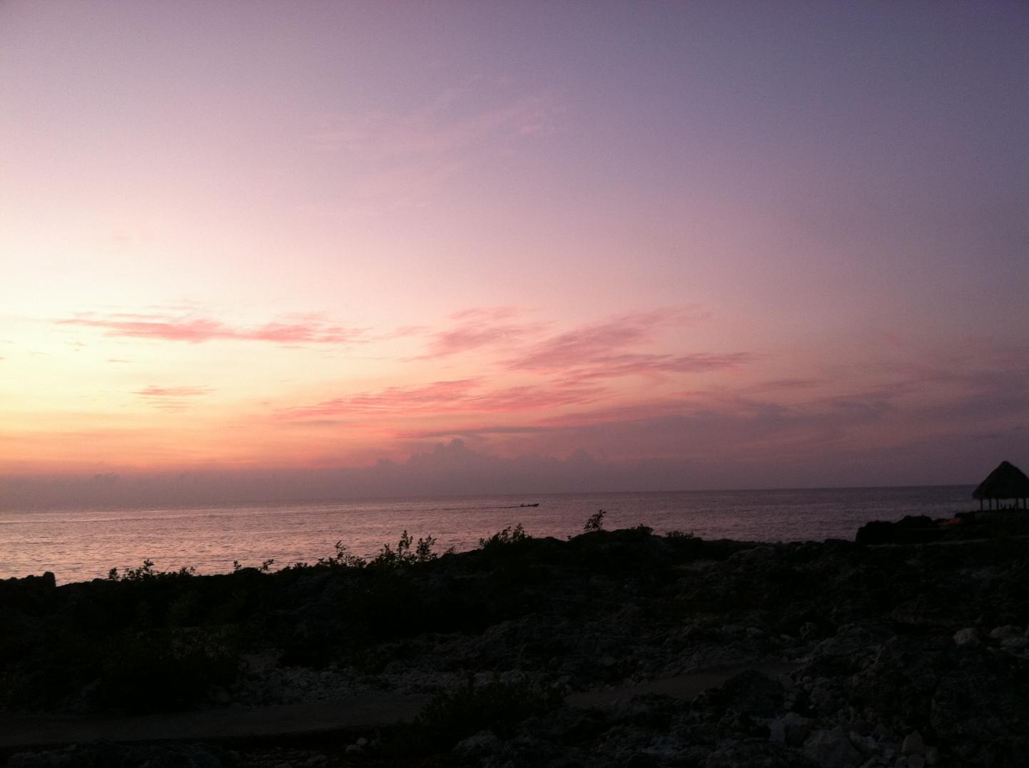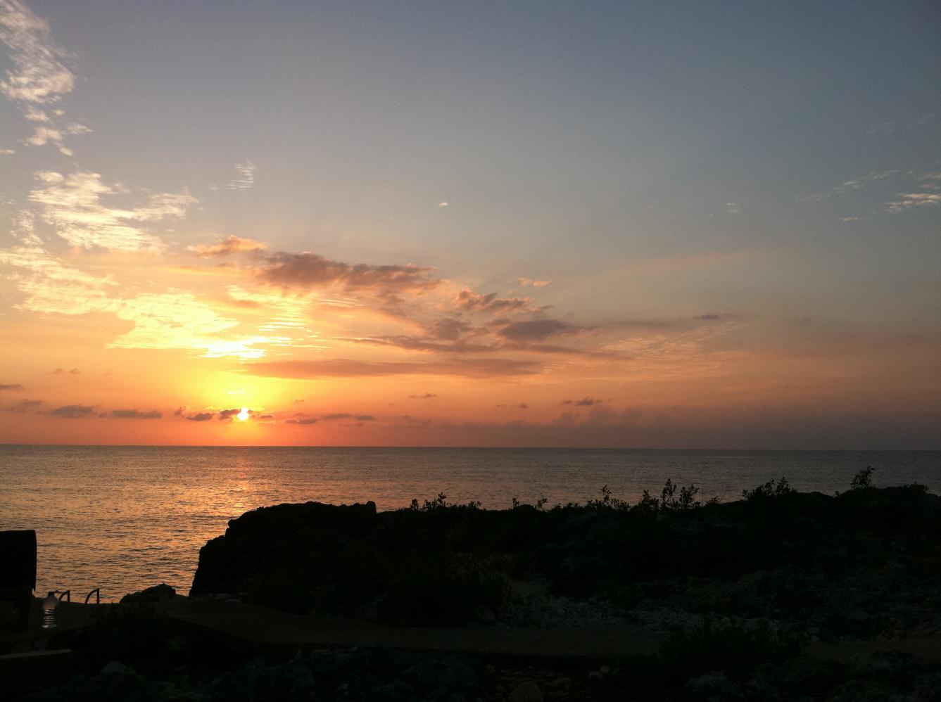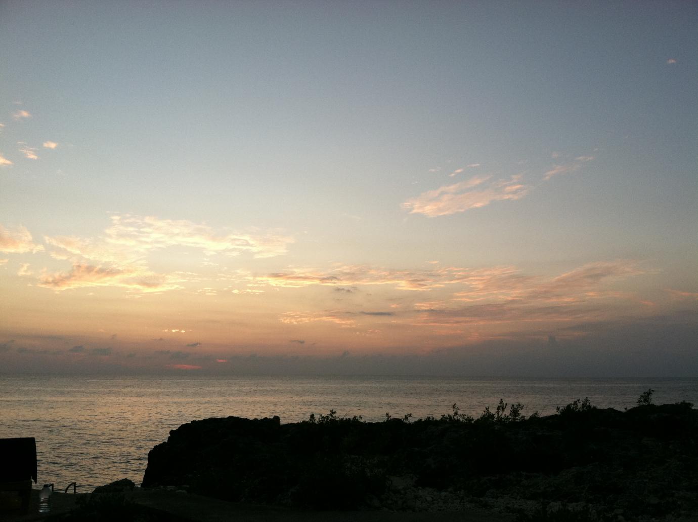 We grab our drinks for a little walk around before the sun sets. The cliffs at Catcha are amongst the best in Negril. Stairs and walkways cross along the cliff face at multiple levels. As these walkways stretch along they meet alcoves in the cliff face at different locations. These alcoves have little terraces built out from them and a variety of chairs, chaises and thatch umbrellas grace the different terraces. There are places where you may have a perch above you and one below but you would never know they were there sitting in your own little private rookery. A normal talking voice is washed out by the white noise of the sea on the cliffs so there is a true sense of seclusion even though you may be less than an easy lob from your cliffmates. We head for the farthest perch, looking around the point over to Ricks and enjoy a few minutes of that intimate isolation. Sweetie Pie looks aglow the soft hues of the setting sun.