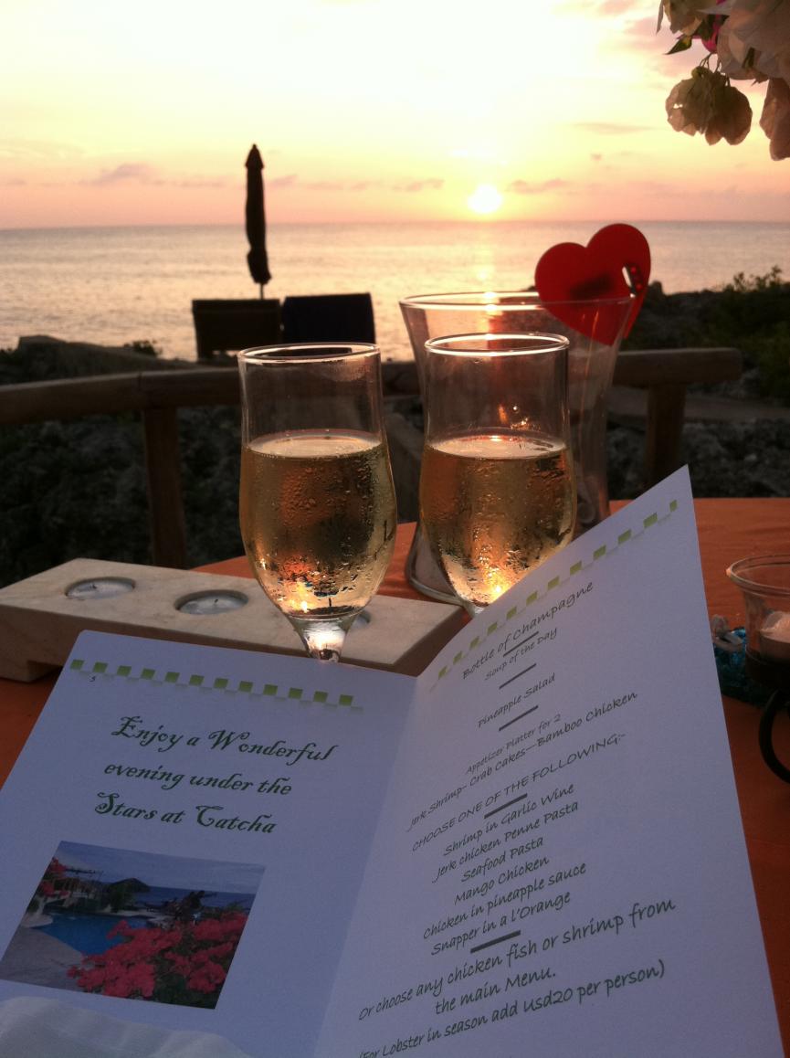 As we head into Catcha Sweetie Pie is looking around. “I don’t remember this place. Where are we? How did I miss this?” she says as we step up to the front desk. “Reservations for the Hundred Candles,” I say. “Welcome Guirigay and Sweetie Pie!” says the front desk lady. Sweetie Pie shoots me just the look I was hoping for – a barely controlled sense of excitement and anticipation. We are escorted through a lush manicured garden that winds amongst the cottages. We pass under flower covered trellises and catch a glimpse of the huge thatch covered bar. “Would you like to grab a drink first?” asks our escort, and we head to the bar. “Your waitress will be with you shortly,” says the gentleman and he quickly disappears. As we grab our first sips of Rum and Ting Sweetie Pie looks out across the cove at a table set with flowers and candles on its own private terrace. She looks at the table and then at me with eyes open wide as her heart. “Yes sweetie, that’s our crib for this evening.” The look on her face is priceless and brings me great joy.