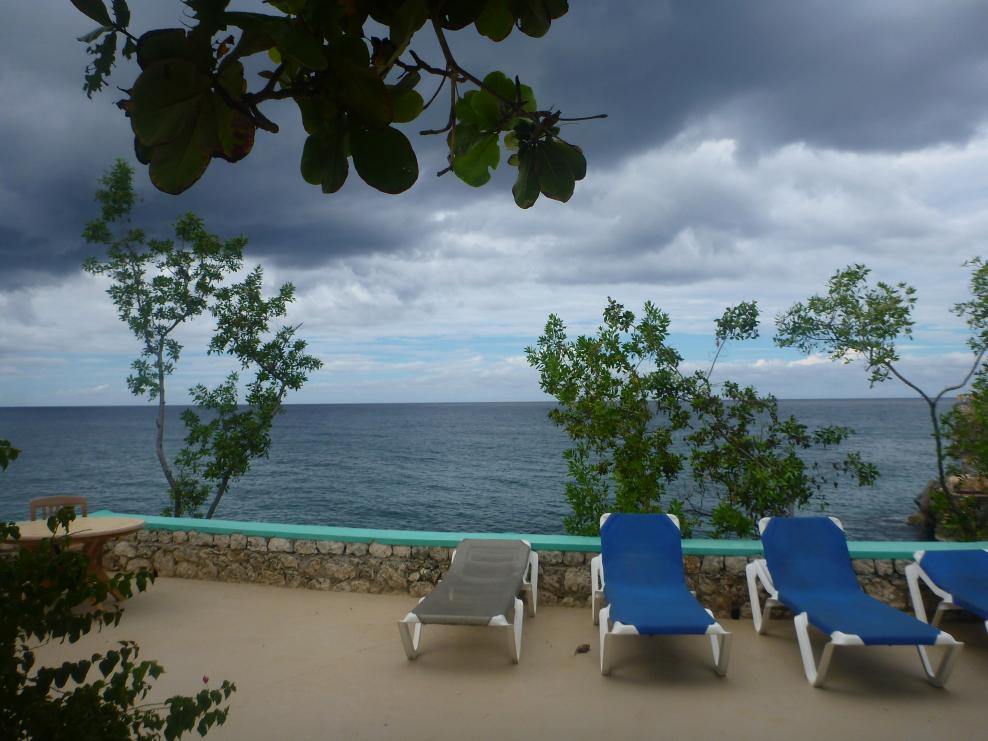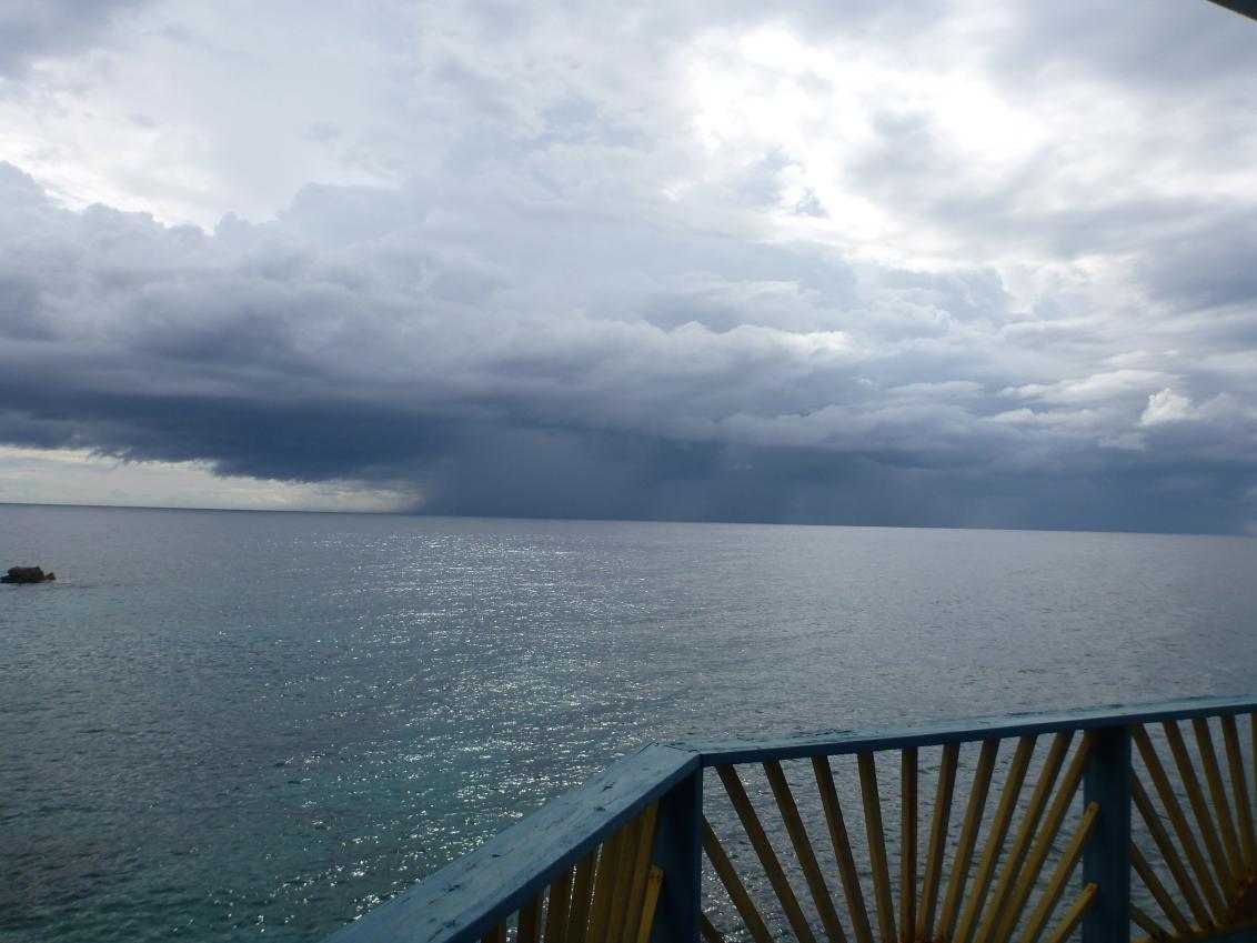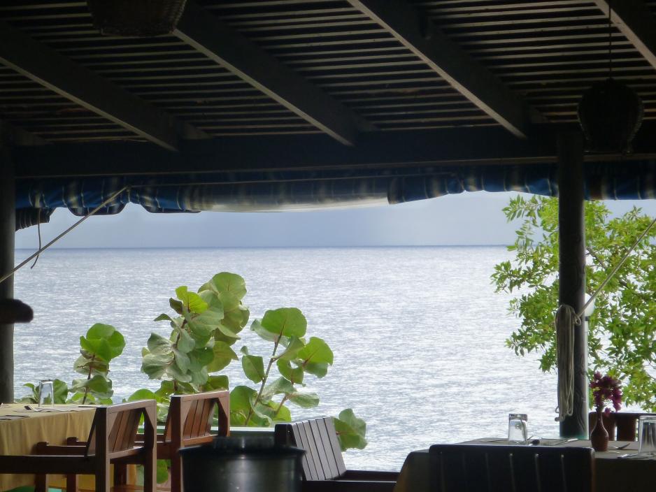 I continue to hang out at the bar for a few hours. Barefoot. Cool breeze. Fans whirring overhead. Staring at the sea. I continue to walk the fence between complete contentment and anxiety. I notice that there is a distinct dark blue line where the sea meets the horizon. Seems strange to me…I always remember sea and horizon melting together. I ask Kevin how long he thinks the seas will stay calm because +1 will want to go for a swim before it’s too late. Kevin says “wake him up now, mon!”
