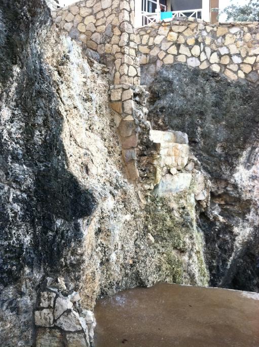 We head down to the cliffs for Tai Chi and are greeted by a waterfall. You can see how it rotted away the steps that used to lead down to the terraces from the pool. The cracks in the cliff face indicate the inevitable fate of all that surrounds us, a peek into actions that operate on geological time scales. It is a perfect place and time for Tai Chi and the splash of the waterfall provides an ambience that brings our master to us; he is always fond of playing new age soundtracks during practice.