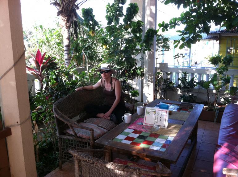 We are awed. “Do you think you would want to live here?” asks Chris. “As beautiful as it is, probably not,” we say. “Yah, mon,” he says, ”One good rain and you can lose your house!” We come around a big curve that circles the hillside of a small hanging valley. On the peak of the spur that shoots out to create this valley sits the small village of Mayfield. It is very picturesque so, of course, we shoot no pictures! Chris gets higgled by a couple of roadside establishments as we roll through town. The craziest part of the road is the last little bit into the parking lot. Chris handles it beautifully. He spends more time navigating the lot for a good shaded parking spot than he does any of the washouts today. “Not gonna park under that mango tree,” he says pointing to his windshield, “made that mistake before!”