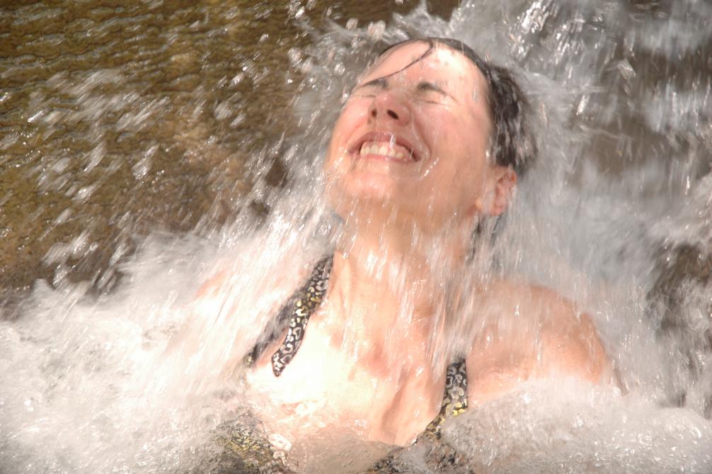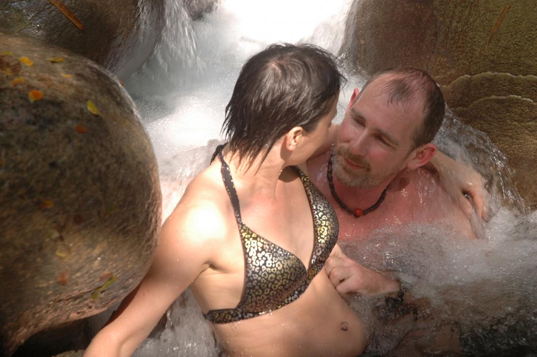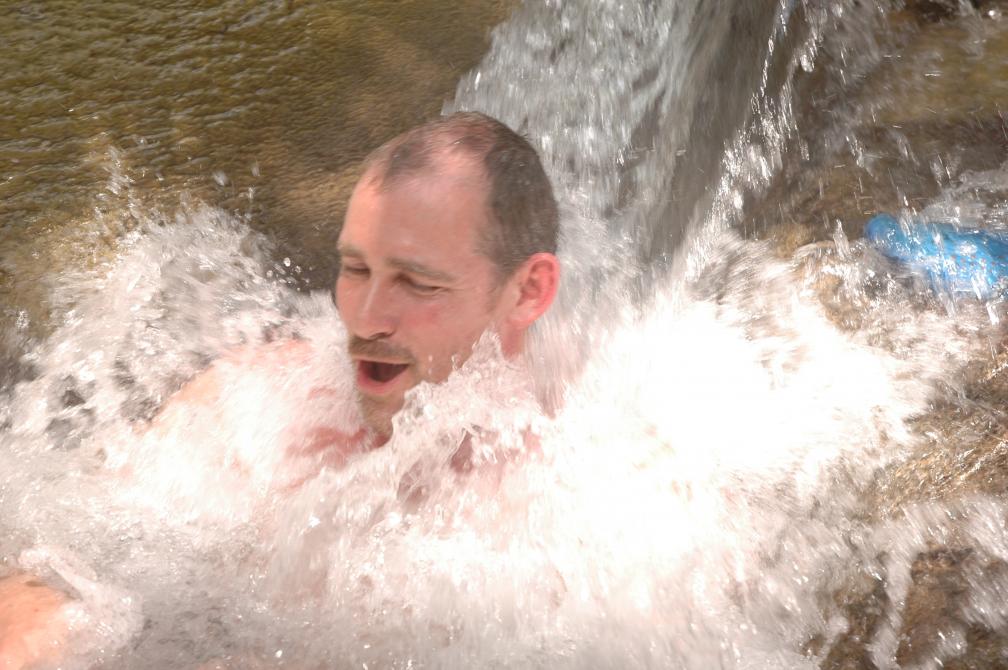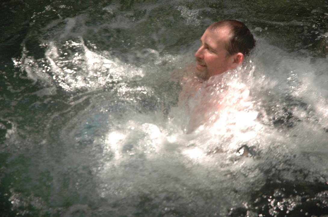 After a couple of nice Jacuzzi seats we approach what looks like another nice little rush of water. “Go on up to it,” says Dave as he walks up to the shore. As you get nearer to the rush the water gets deeper than any place we’ve been in the river yet. Eventually you can’t touch bottom and the current of the river pushes you back. Dave and Eneil laugh. I won’t be denied and I backstroke my way to the eddy and swim in place for a bit. It’s a very unusual and enjoyable sensation. “Yah, mon, that’s the way you do it!” encourage Dave and Eneil.