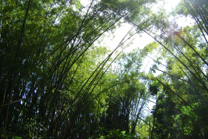 As we get a little ways up the river we’ve passed several impressive bunches of flora that Dave just won’t seem to mention so I have to say, “Look up on the hillside, Sweetie Pie, see how tall and straight they are, that’s some BIG BAMBOO!” I get a good laugh from everybody. There are large clumps of bamboo all along the upper hillsides of the river bank here. They bend and meet over the river like gothic cathedral vaults. It adds to the sense of making a verdant pilgrimage.