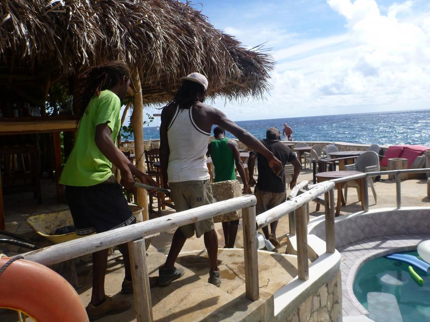 The One Love bus is fairly full already with shall I say...seasoned Negril lovers who aren't going to let Sandy get us down. We make the various stops along the cliff road and then beach road to pick up other like-minded brave souls. It just so happens we have coerced a beautiful lady friend from Xtabi as well as an awesomely hilarious British couple from Sandy Haven, who we had met earlier in our trip, to go along with this hurricane party on wheels. With the bus full, Lenbert makes an observation, “You all are the only tourists out today, yeah mon!” He is met with cheers from the crowd. You see apparently the big AIs have really enforced their ‘it’s not safe to leave the walls of the compound’ rule. They put their guests on lockdown, if you will. Reason number 4,347,128 to not stay at an AI, imho.