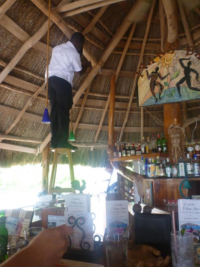 Eventually, we wandered over to the bar to find out the full sit. Dwight was supposed to be working today and I was eager to say hi. Turns out Omar is at the bar...Dwight called in sick, lol. Omar informs us the hurricane is supposed to pass over the east side of the island around 5pm today. Oh, so we are still in limbo here...waiting for this bea-atch to show up. It also dawns on me that today is moving day. I am kicking myself right now because not only do we have to pack up, but now I have to lug all of those "hurricane supplies" a.k.a. a 12 pack of Red Stripe, half a bottle of JB and 2 bags of snacks to Catcha. You would think I would try to lighten my load by a few beers or so, but the RS burn-out is fierce this morning. Dave happens to walk by and says "Have a nice time at Catcha. It will be rougher there." with a devilish little grin. Thanks, Dave! Not helping my nervous anxiety this morning. You happen to have a xanax or 5?