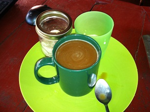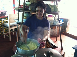 Left-to-right: Mi w. Bigga, the kitchen/restaurant zone, mi coffee service, and Gwen cooking for the crew!