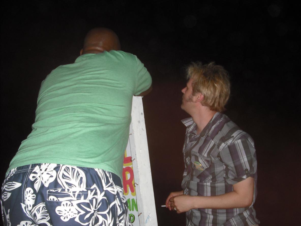 About that time, up walked Brasi. He came up and joined us for a moment at the bar and then mentioned the idea of heading next door for some jerk chicken. We all agreed that sounded like a plan and off we went. Right next door to Seasplash (sorry, forgot the name of the place) was a little jerk barrel and shack. We placed our order and then grabbed a seat at the table. We all talked and had a nice visit. Then our attention soon after went to the moon. It was AMAZING. We all had a different description of what we were seeing. Someone said it looked like devil horns, someone else thought it looked like a jack-o-lantern, but whatever you thought, we all agreed it was amazing. So of course this meant that Markus and Ninja would have to make it their goal to capture the perfect photo of it. I believe they literally spent 30 minutes or more trying to find the correct setting on the camera coupled with the right angle and the perfect object for a tripod, I am sure there were wind measurements and barometric pressure considerations and possible use of the Pythagorean theorem as well. I spent about the same amount of time trying to take a photo of them trying to take a picture of the moon, it was comedy (of course that too was on the camera I lost, so this photo is courtesy of Muzikdoc, thanks so much) It was too funny of a moment not to have captured on film.