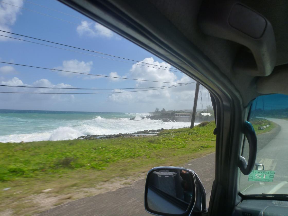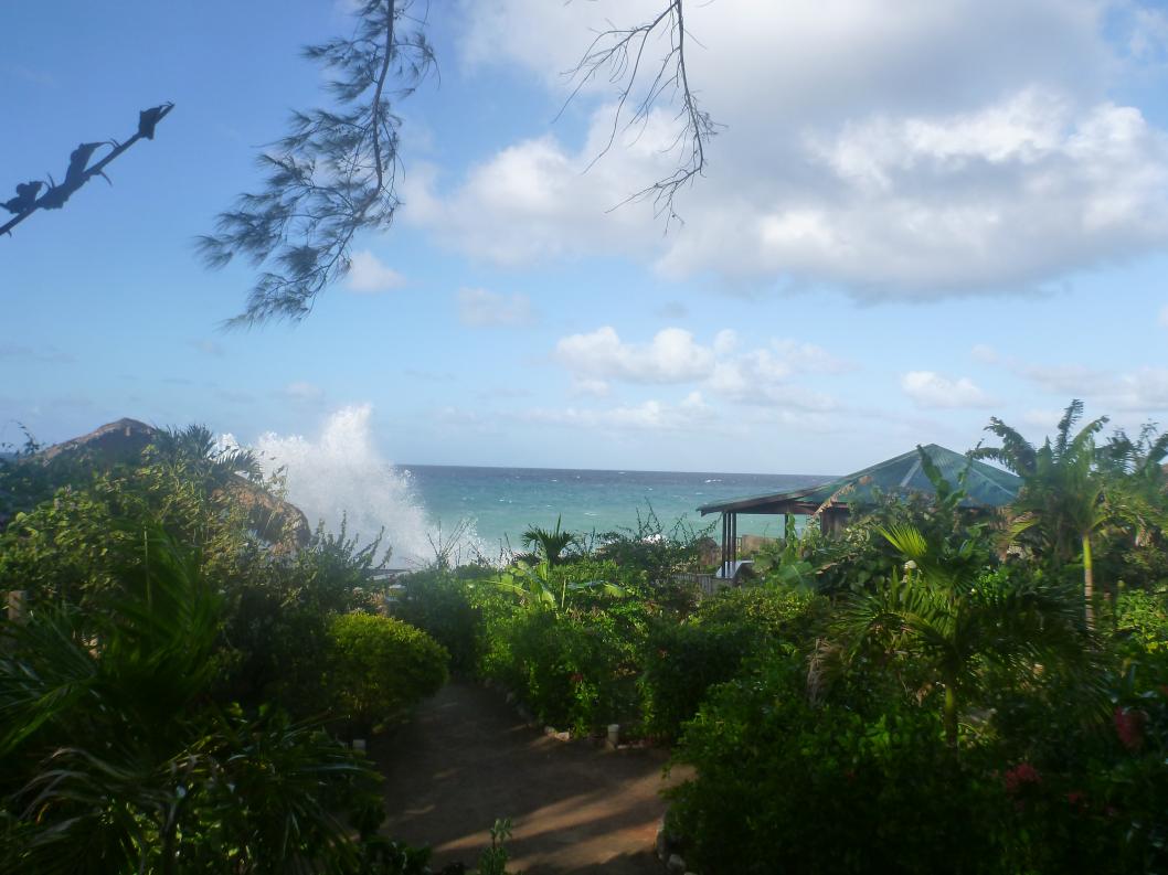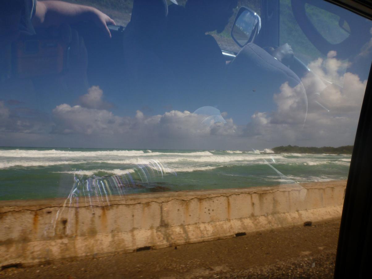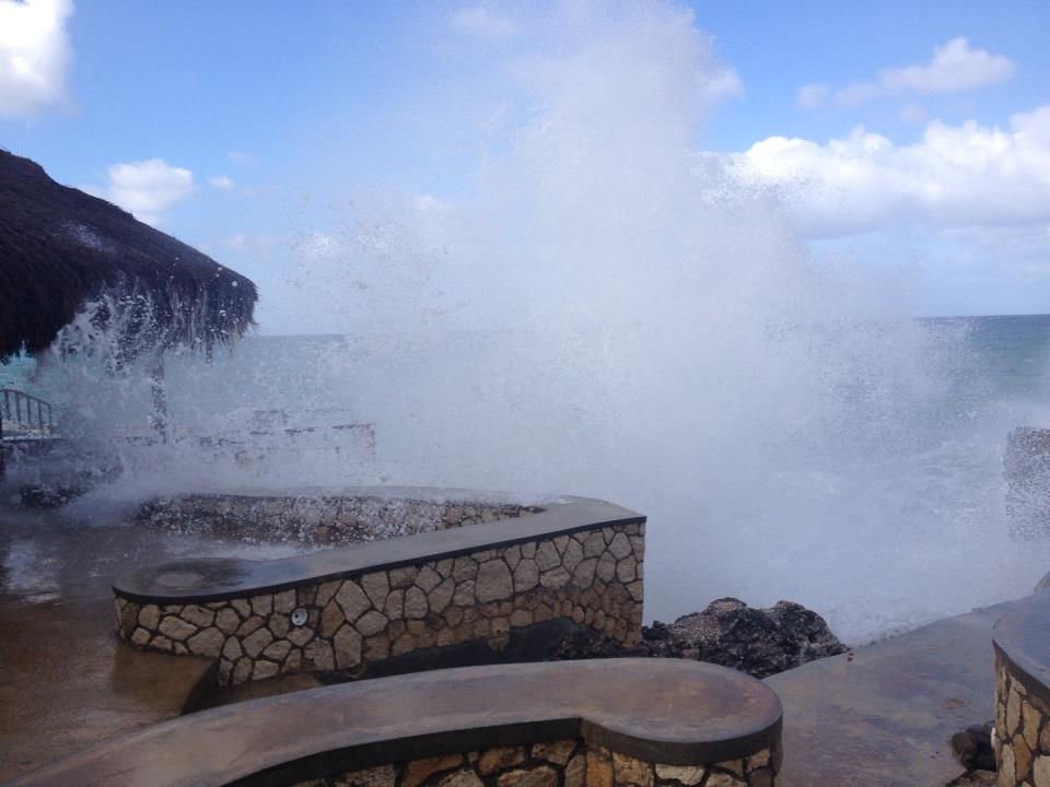 We roll out of bed around 7am, groggy and grumpy! Sweet Carol comes to the back door and lets us know that they will be providing room service for breakfast because Ivans is closed due to the seas really picking up. (ok, i wasn't hallucinating that part, whew!) We ask her for a couple of cups of coffee and step outside to take some pictures. Yes, the waves are crashing over Ivans roof!