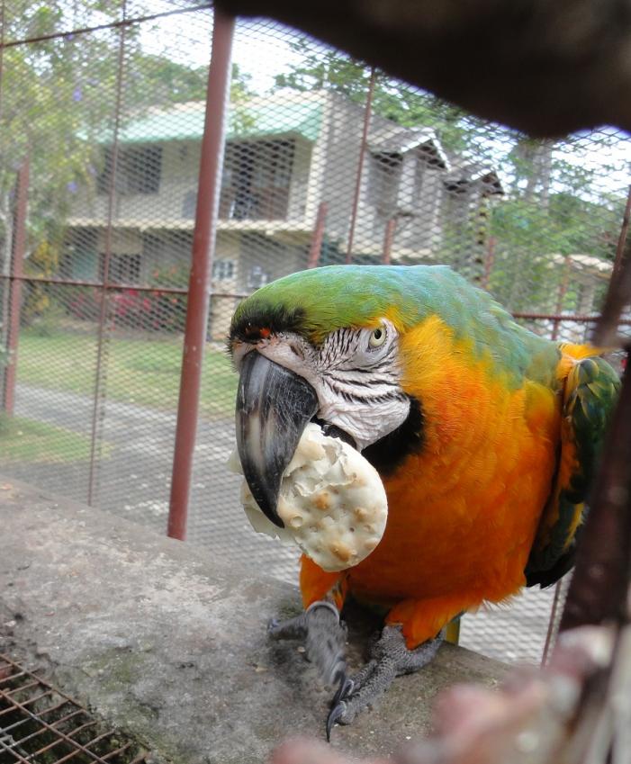 Polly (Sinbad) wanna cracker? This is the Dude's papa. He takes the water cracker, nibbles on it a bit then goes over to his water bowl and then dunks it. Smart bird. Remember the parrot toy we put in the cage the second day I got here? This morning I visited the birds and saw that the toy has been totally destroyed – just a chain hanging there now. So I guess they liked it.