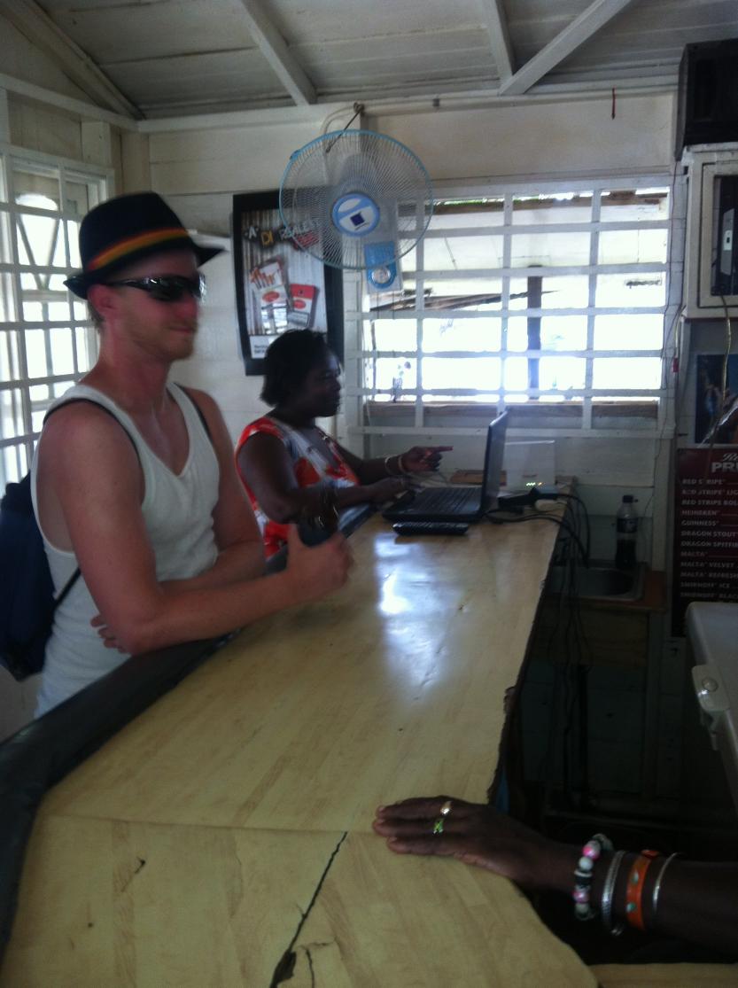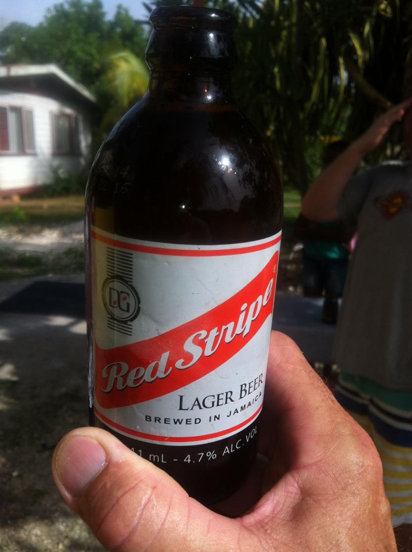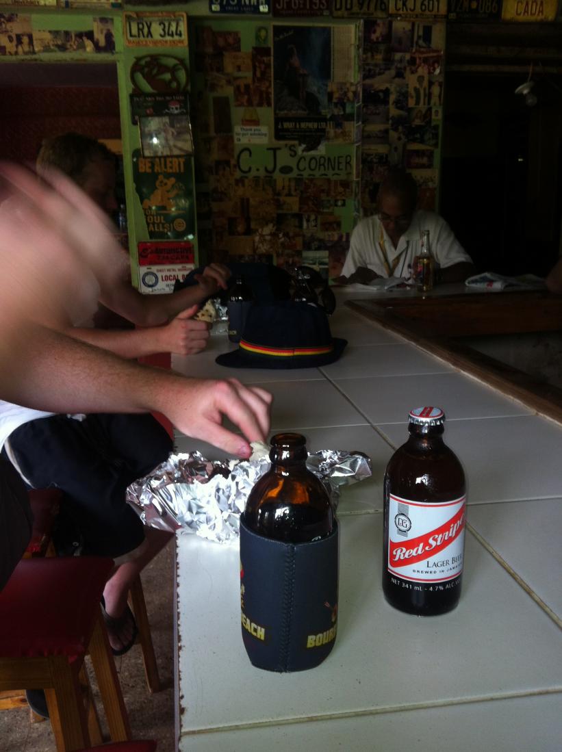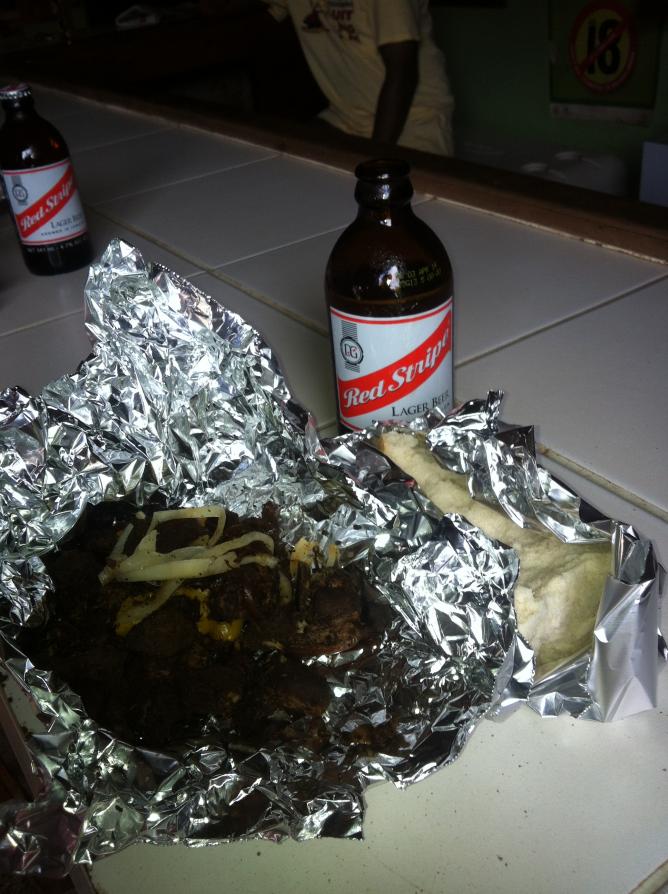 So we get to the Red Dragon Grab a round of Redstripe, and head over for some jerk pork!