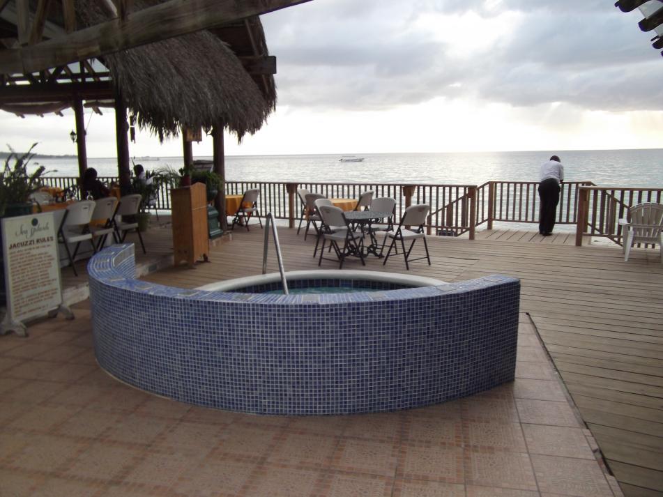 I stand out side of what I think is Jims room, he invited us last night but we told him we would prob be tired from moving...didnt want to knock on someone elses door by mistake, so I let out a PIG SOOUEY, and I knew if a Hawg was within hearing distance, he would come arunnin'....and he did...lol...he came to the door, and we went inside to visiti for a minute. didnt want to intrude on the lovely couple and their last night in paradise, so we told them of the webcast idea...we were informed no sunday webcast for a couple of weeks now...oops, didnt know...we share a few things and then we tell them we want to see the sunset, as an excuse to leave them alone...but jim insists on joining us, so we all go to the pool area, and have a few two for ones, rum punchs, red stripes, and anything else we can get our fingers on....Jim orders lobster dinner for himself and jerk chicken for gigi form the guy next door...he is bragging on how good the place was....I take a few pics while we trade bs stories...