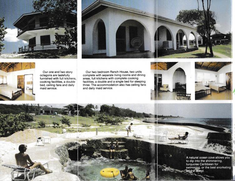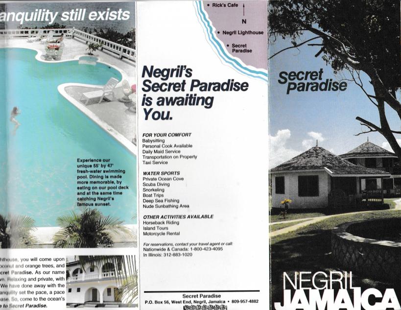 Unless you're familiar with the far West End, you might not be familiar with Secret Paradise. This is the brochure that reeled us in one nasty winter in ~1986. No phone and dirt road. We couldn't afford renting a car, but a bunch of people from Chicago area carried us with them. The sea got so calm, I tried to snorkel in the moon light. Really spooky and cold! My 1st parasailing and $100 dollar lobster pizza. That was $J's not $US.