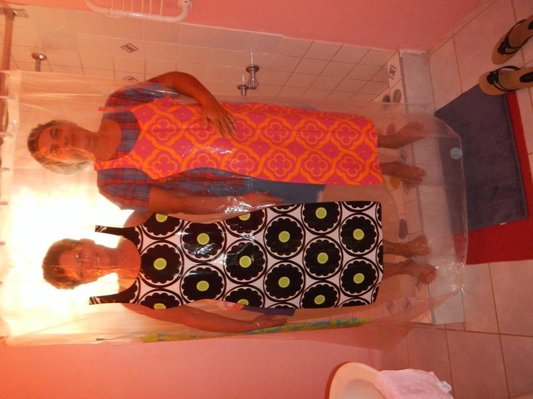 Miss Millie and I having some FUN with the new shower curtain ~~