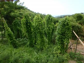 Yam vines. They grow 20 feet in a year and then the roots are harvested.They are huge. 3x the with of a mans arm and a couple feet long. They are sliced up and boiled. Mildly sweet and a great starch. The picture here is yam vines last August. We will be having a meal of them after Christmas. Can't wait........