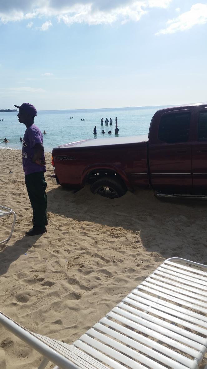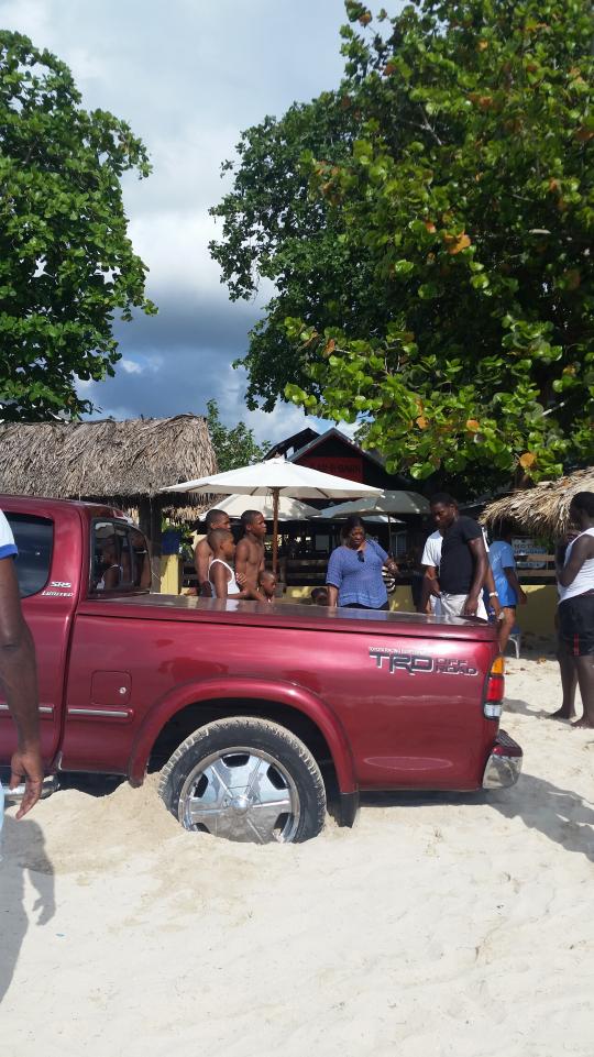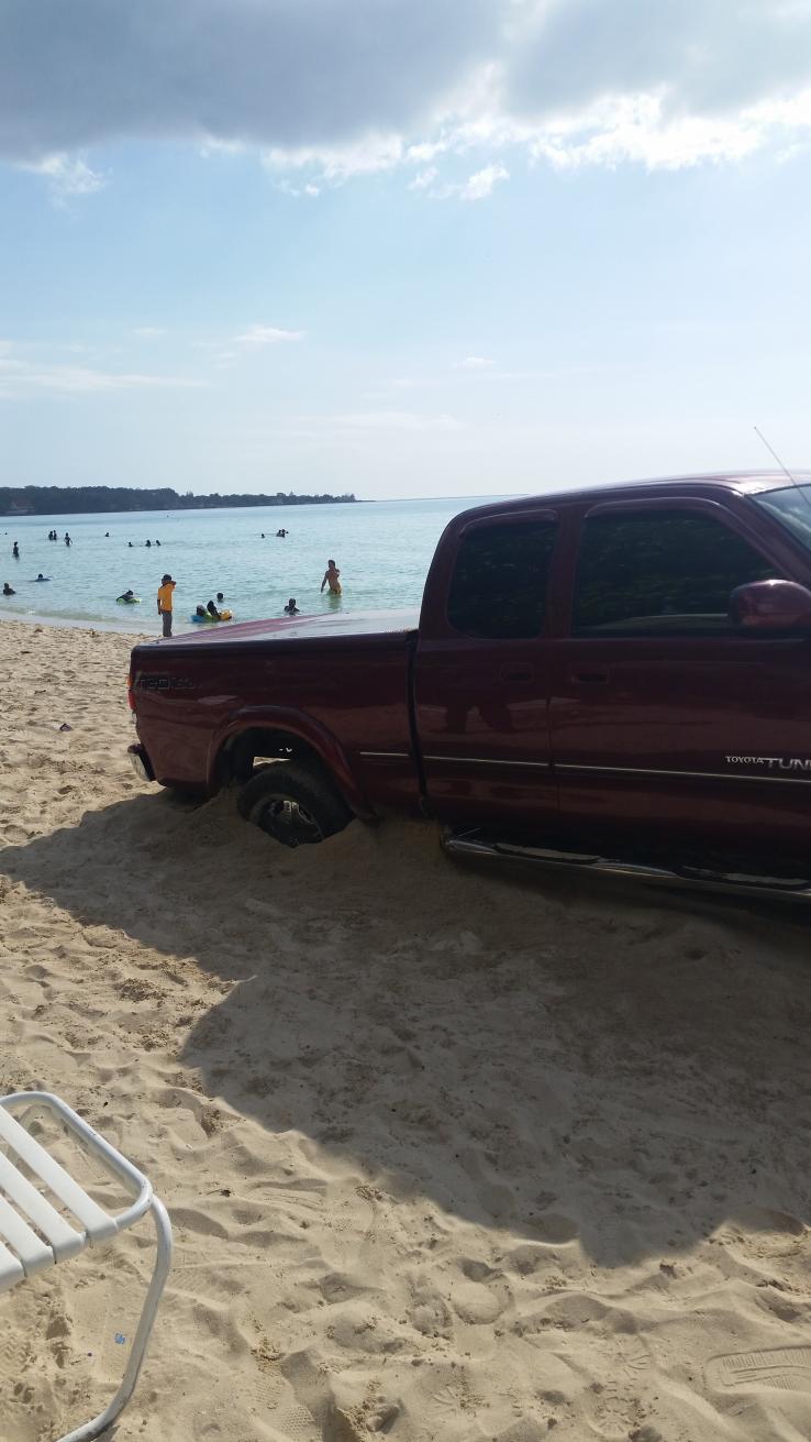 I was sitting at BarBBarn when I saw a truck coming out the lane and take a left up the beach...he got about 10 yards before he was stuck....about 3 hours later, and 1000's of suggestions by the crowd, he was finally pulled around by a 4 wheel drive toyota