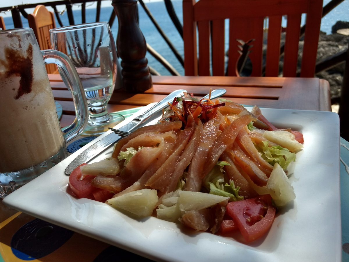 I see why they call it Quality’s See Breeze. The stand is across the road from the ocean but with an unobstructed view and breeze. We stepped inside where two ladies were relaxing at the tables. When we inquired about lunch she said that the chef was at the market in Sav getting supplies. He’d be back in an hour but our stomachs couldn’t wait that long so we sauntered over to Canoe where we were the first lunch patrons. Canoe is a nice place. The view and open air is an amazing atmosphere. We ordered the lionfish entrée and the mahi mahi entrée. The fish was just OK. In hindsight I imagine our waitress had nudged us towards the specials board for good reason. The veggies were great though. That’s a trend I was noticing. Amazing huge portions of vegetables at every meal really gives you good energy for adventure.