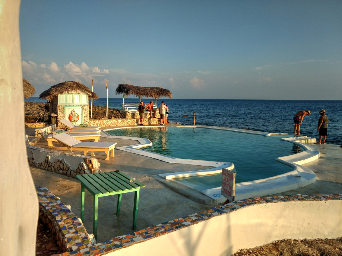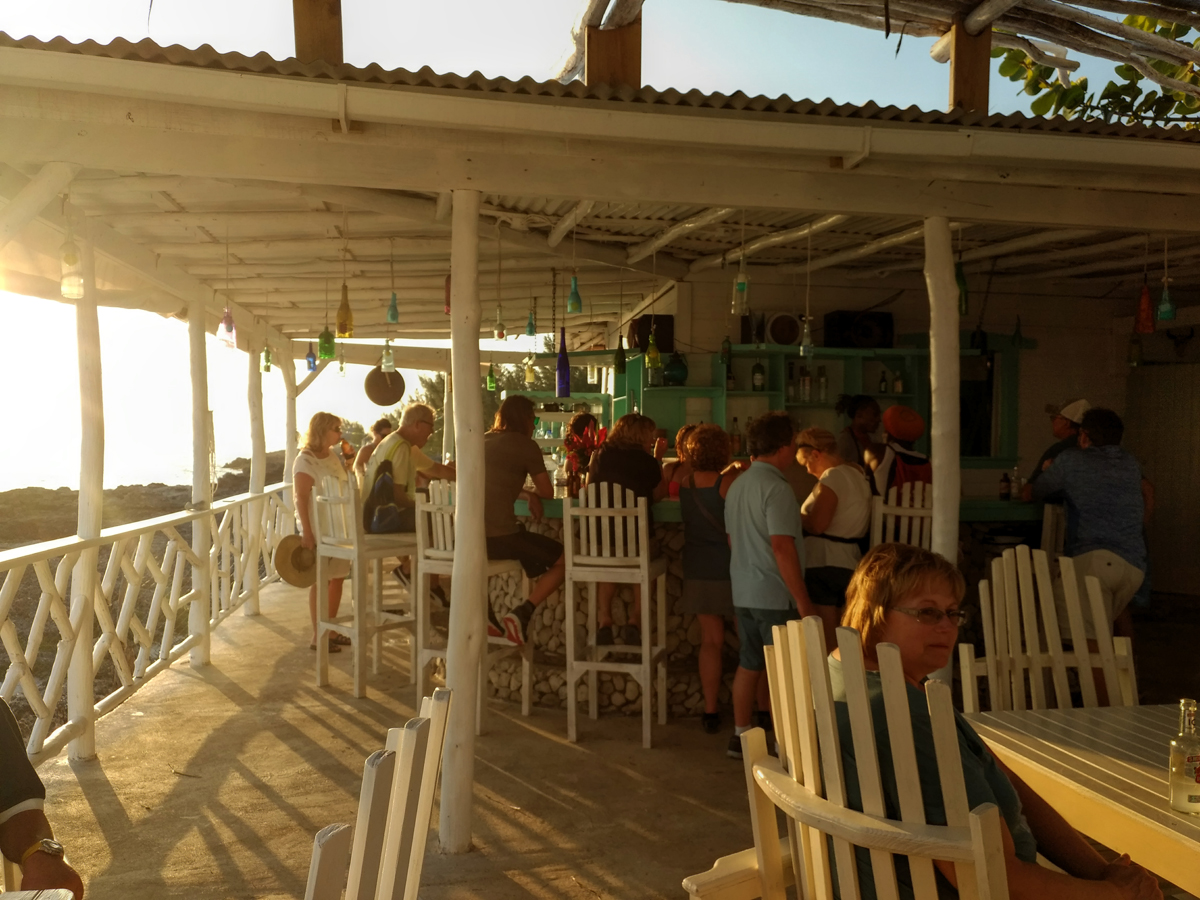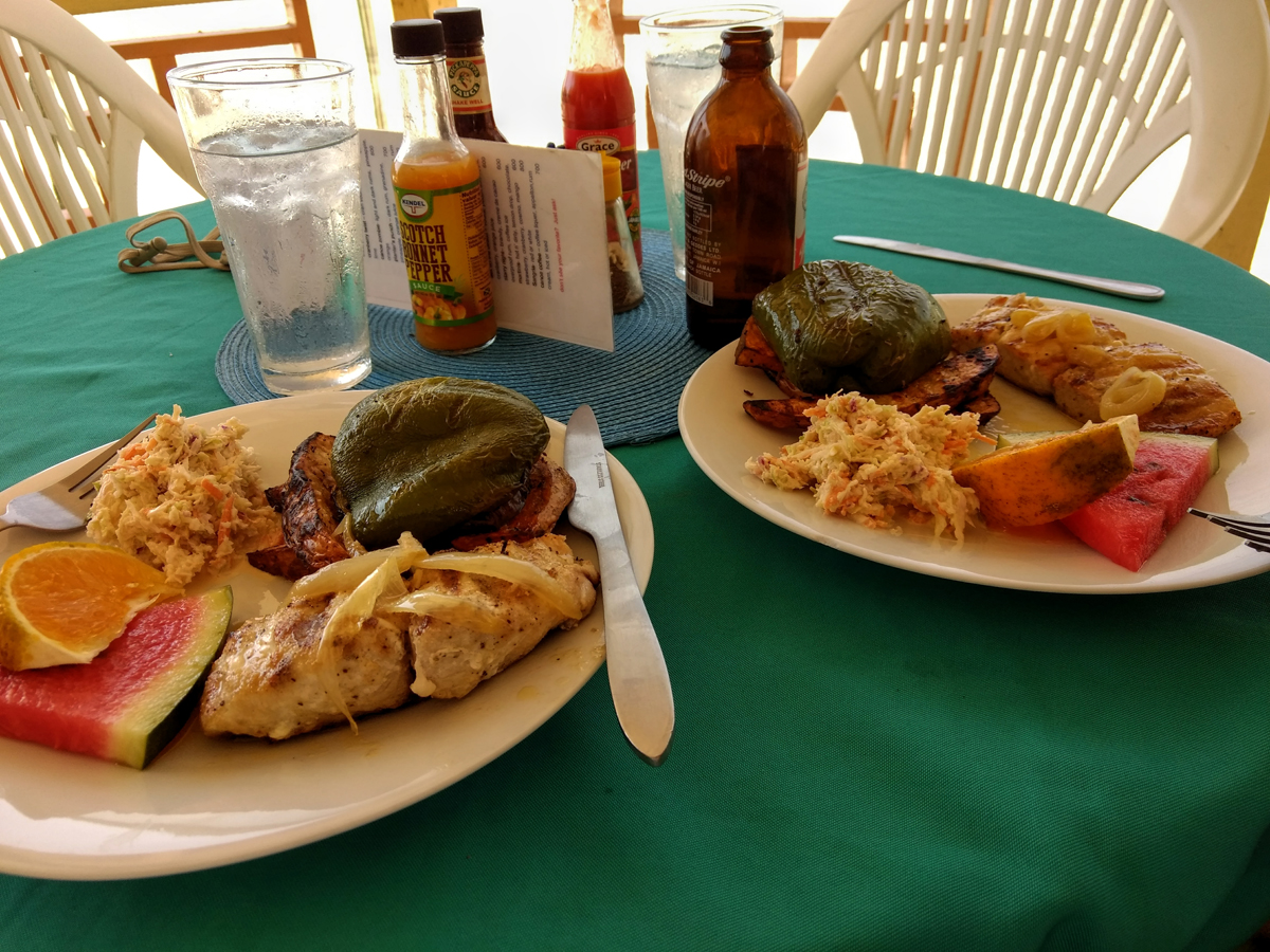 After watching sunset at The Sands we only had a short drive to Tensing Pen. The moment we got off the bus with Bill and Robin, all four of us knew it was time to eat. We headed right across the street to Shark’s. Unfortunately, right as we walked up a group of 2 and another of 5 sat down. I think we all had a decent buzz going, and combined with a few more at Shark’s, we easily passed the 2 hour wait with plenty of laughs and discussion. At one point while we waited the power to the building went out. One of the women walked over to the power lines and fixed it by jiggling them with a long pole. No problem mon! My wife had curry conch and I had brown stew fish. Both were really good with amazingly rich flavors. After the woman asked us how many beers we had drank, she wrote up the bill. We settled up and sashayed back across the street having earned a night’s deep sleep.