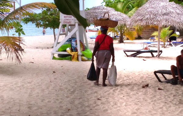 She wakes around 5AM and by 6 she has bought her days supply of fresh picked fruits at the farmers market on her way to the Beach...she arrives 'bout 10AM and walks the area Roots Bamboo to Coral Seas..her day will end around 6PM and back home by 8:30-9:00PM......