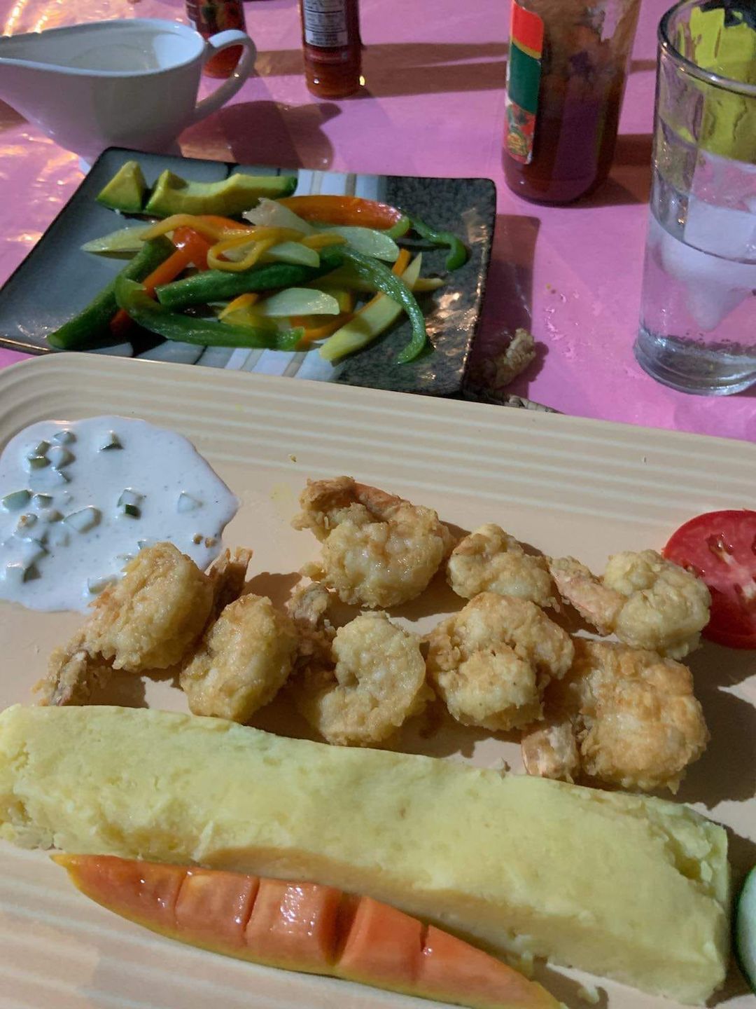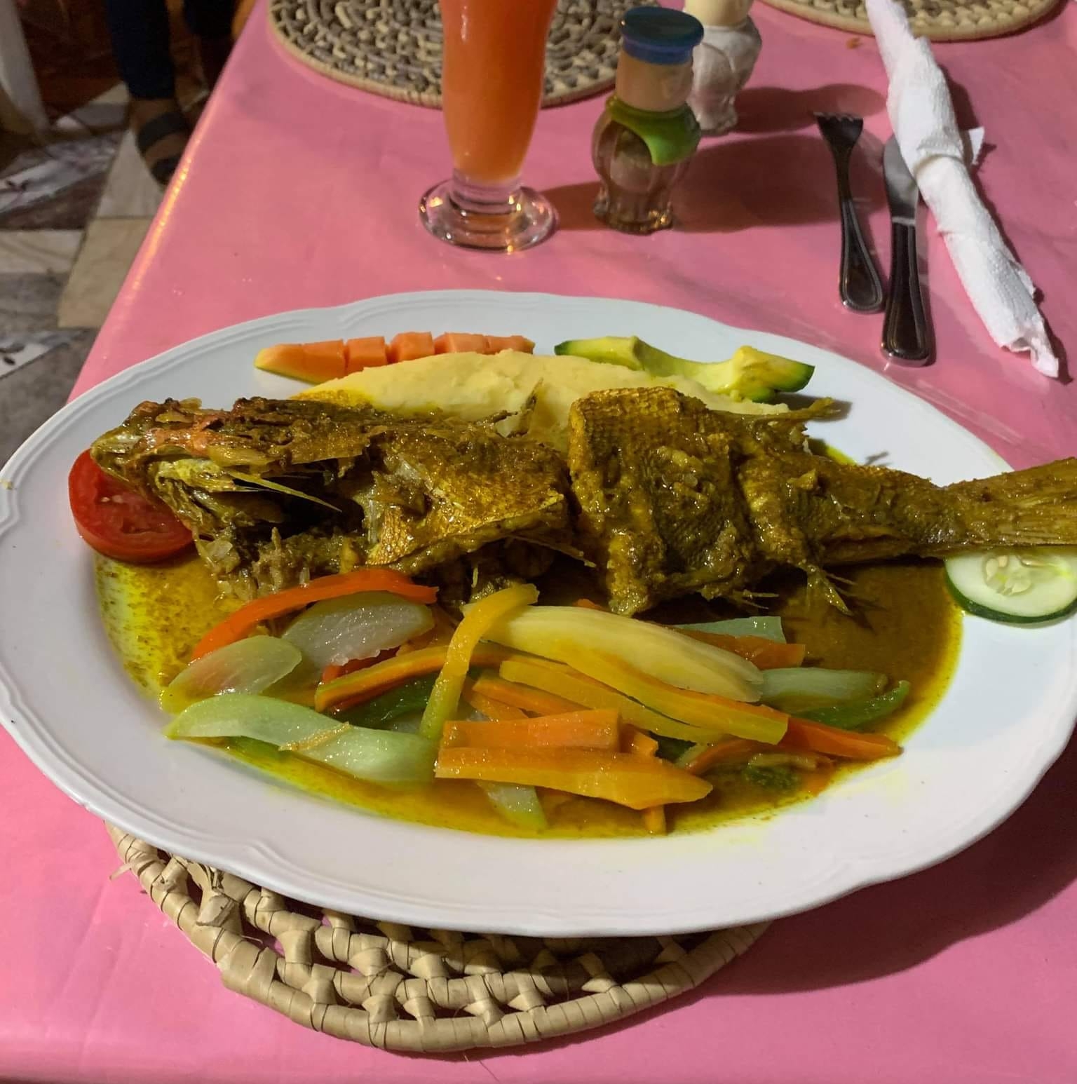 The last of the businesses to visit was Quality’s Sea Breeze. He was completely surprised by the money we delivered. He says he is truly blessed! Actually, we were the ones blessed to be able to deliver this money to everyone and see them in person. We can’t thank you all enough for all the purchases of shirts and donations to the Soup Kitchen. While we were at Quality’s, what else could we do but eat a delicious meal? Of course!!! Monty had a curried whole snapper, mash, veggies and fruit and I had the fried shrimp with the same sides! His food is always so fresh and amazing!