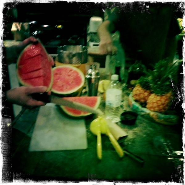 Cut rind from watermelon and pineapple; dice fruit into large chunks. Place strainer over large bowl and start squeezing juice from fruit, preferably by hand. Add a couple pours of rum every once in a while until the bottles are empty. Squeeze grapefruit; add syrup, honey, bitters and Campari. Sample a small taste to confirm the right balance of sweet and sour.