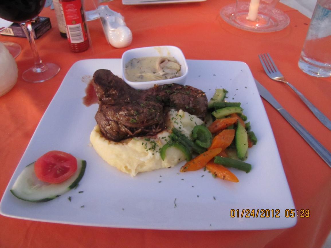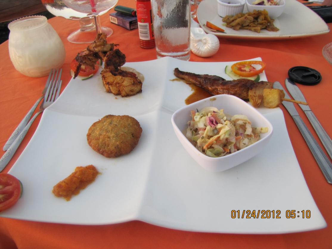 Tuesday morning comes and we roll outta bed, finally a night with more than 3-4 hours of sleep. I feel human finally and am ready to venture out and see what Negril has to offer today, but first must have morning coffee! Brew a pot, crack the Rum Cream and the day is off to a really great start. Since we had bought groceries we decided to have a good breakfast before we go out walking, we have a big Breakfast (Streaky Bacon, Eggs, Toast, more coffe and even more Rum Cream), on the patio patio of course just taking in the great view. We get dressed, grab a couple of Tig's from the fridge, a couple of water and head out to find our way to Long bay! We wander aimlessly until we are approached by a nice older lady asking if we are lost, we bashfully say we want to walk the beach she says to follow her, away we go. She takes out to the Au Natural beach and points us over to Hedo and says straight through there! Now I am far from a prude and my wife is a little more reserved than I am, but I really must say no showering after a hockey game or after a workout at the gym could prepare me for all the casual nakedness we walked through!!!LOL!!!!My wife was almost hyperventelating and had a deathgrip on my hand, Between people bending over to pick up packages of smoke, or the eyefull's of gravity over time effected flesh she was on the verge of meltdown! Later we find out it was during a particular lifestyles week, so there was even more open affection day or night and more nakedness than usual, either way it provided a good chuckle to everyone who heard the story for quite sometime when I would describe the look on her face, LOL!!! We wander the beach, hitting stands, stores you name it. Grab a dink here then there and so one down the beach. It seems like no time has past and it is already lunchtime, I am hungr and lightheaded from the stripes, I look at my Negril map and realize we have only made it about 2-2.5 Km. We stop at Foote Prints in the sand and grab lunch, it was good but not memorable so I cannot say really what we had. We chill out with a couple more stripes and decide we will head back to the Condo to take in a couple hours of beachtime and maybe do a little snorkling, its about 2pm and we have a few hours to kill before supper at Ivan's. This is the one I had planned as a special dinner for my wife and I and she was super excited. I had played it down a bit cause I stillwanted some WOW factor when we arrive and take our seat, I had requested the"nicest" table they had as it was our Honeymoon and they did not dissapoint! We overlooked the cove just above the hotub, was a great night, great food, great view, and great service! I had the Seafood pasta, and my wife had steak and mashed Potatoe, we also shared a couple of appatizers. Here's some photo's!!!