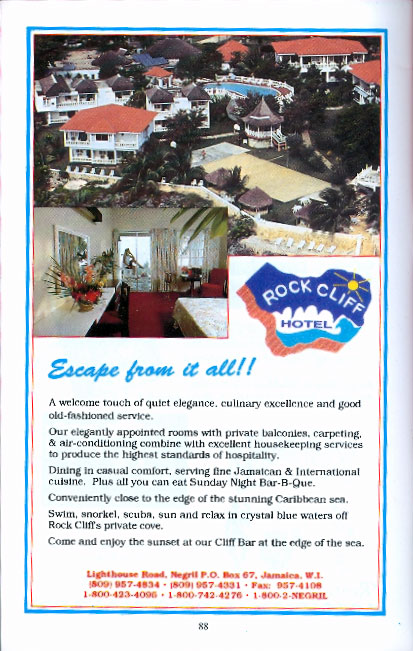 From the '96 guide an ad for the Rock Cliff Hotel...had a very fine restaurant as I recall. When last I was in Negril it was still in a very sorry state of disrepair (although not yet as bad as T-Water). The Rock Cliff would certainly be a candidate for The Travel Channel's Hotel Impossible.Attachment 20916