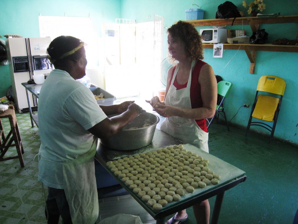 Once the breakfast rush was over it was time to finish up lunch. Lunch was going to be soup and water or juice. We helped cut up vegetables that I had never heard of and then Vilma had my wife help her make mini dumplings that were going to be put into the soup. The soup also had chicken legs in it.