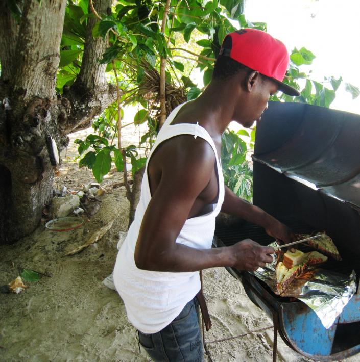 On Tuesday morning we left the resort at 6.30 and headed out to St. Anthony’s Soup Kitchen. We were waiting for a route taxi but a van accepted $300 JA to take us there. Miss Sonia, Vilma and one other lady start bright and early preparing breakfast for the 35 or so kids that they sponsor. They have some other volunteers that stop by when they can and welcome tourists any day. This day breakfast was an egg or peanut butter sandwich, hot chocolate and cookies for a snack later on. We helped dish out the food, wrap cookies and anything else they asked us to do.