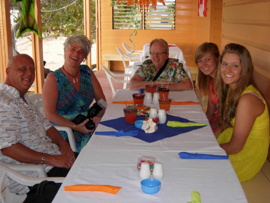 Saturday during the day was more of the same...floating, enjoying the vendors, soaking up the sun, and of course, a few more Red Stripes. Tonight was the big dinner at Canoe. Everyone was to be ready and meet in the lobby at 5:00. I was up a bit early so that I could figure out transportation. I had given a couple of recommended drivers a call, but not enough luck. It's one thing for hubby and I to jump in a route taxi and go...it's another thing entirely to get 25 people somewhere. Especially when most of them are newbies. I was trying really really hard not to be the tour director all of the time and just wanted this to be easy. Walked up to the taxi stand and chatted with the girl there. Suddenly, a driver walks up that I recognize. David drives a JUTA bus, and had taken us on a couple of rides on previous trips. He has a big bus that can take everyone in one fell swoop to Canoe. Perfect. Again, I'm feeling just too lazy, or perhaps overwhelmed, by the possibility of getting everyone individual cabs on the road. David was great! He was entertaining as he gave everyone the tour of Negril and everyone was happy to be together. We arrive at Canoe and I am blown away with what Patty has done. It is simply perfect. Everything from the tables to the decorations to the rum punches upon arrival are top notch! We spend some time just enjoying the vibe there, chatting and having some of drinks. Dinner was served about an hour later as the sun was setting. Perfection. We had arranged two choices for everyone ahead of time: grilled snapper or jerk chicken. Everyone LOVED the food. After dinner, there were many more drinks to be had. Grandpa even bought all the boys a round of tequila shots ~ what?! LOL Grandpa doesn't drink much...other than an occasional glass of wine. To see he and grandma do a shot of tequila got everyone going! We spend a couple more hours just enjoying ourselves. During this time, a dessert sampler was served. Again ~ YUM! I mentioned before that Patty really went all out for the night. The night ended with hugs for the kitchen staff, the girls at the bar, and of course, Patty and Kirby from everyone!