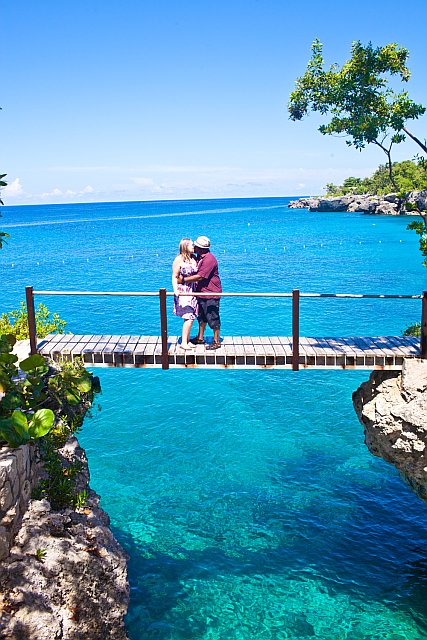 So we get up and Rye comes and picks us up at Catcha and we are off. Our first stop was Margaritaville. We took some pictures on the funky bus and all around the beach and the property. Lots of bright colors and fun pics there. After that we headed to Boardwalk Village, which really is a nice and cute little place, also lots of bright colors. They had a pushcart and we took some pictures there with that. Then we headed up the beach a little and took some pictures. We had wanted to take pictures on the beach the day after our wedding last year but the storm had done lots of damage and the beach wasnt looking so great so that is why we went out to the beach on this shoot. After we took some pictures we headed back up to the cliffs, but first we made a stop at RockHouse. You see Rockhouse was the the place I laid eyes on back in 1999 (first trip) and it was the location I fell in love with. It was then that I had said "One day I will get married there" And Rockhouse was the place I had always told everyone about. We used to hang at the Pickled Parrot and I thought that the RockHouse was the most beautiful place I had ever seen. Well over the years it has gotten pretty big, and popular and now they only do about 10-15 weddings a year and they book fast and they are EXPENSIVE....so I kind of gave up on that dream a while back, but never fear, from the moment I had found Catcha, I had a new love and I was fine with that. But I did always wish I could go there and perhaps take pictures on property for my wedding, especially on the bridge! (I have so many photos of this place over the years lol). Anyways that also didnt work out last year but both Rye and Raul remembered that I wanted to do that so we stopped to see if they would let us.....and they did.....so we had a fun mini photo shoot at Rockhouse! And it was beautiful!