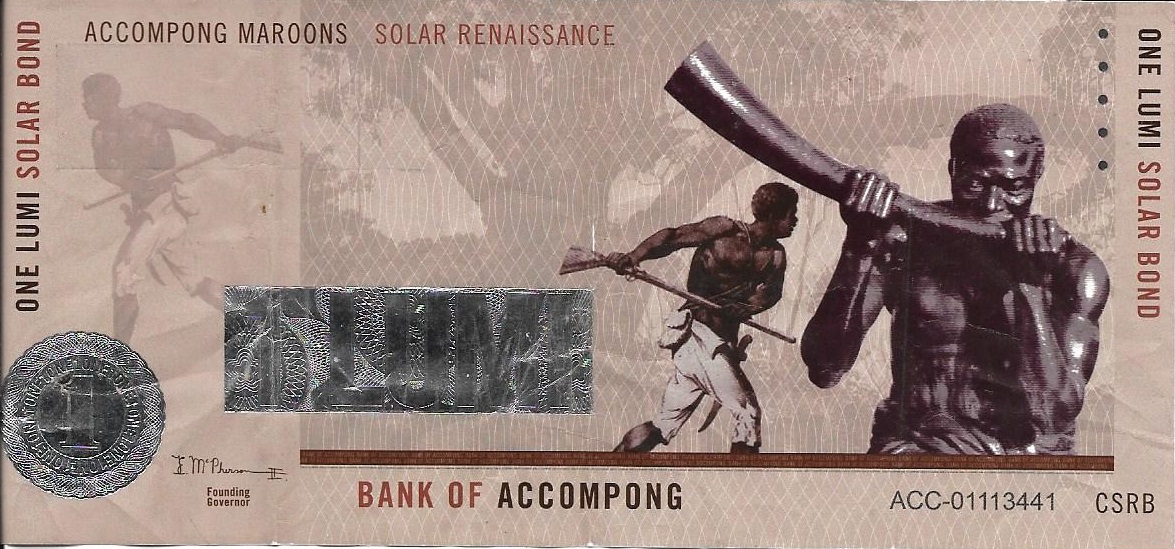 While on the topic of the Cockpits, I would like to share two pictures of the front and back of the LUMI currency currently being used internally by some of the residents of Accompong Town, St. Elizabeth Jamaica. There are still open question as to its legitimacy as a legal tender sanctioned by the Bank of Jamaica but, as of now, it is traded at some establishments in the town and there is a bank where it can be exchanged for Jamaican Currency when the bank is open.