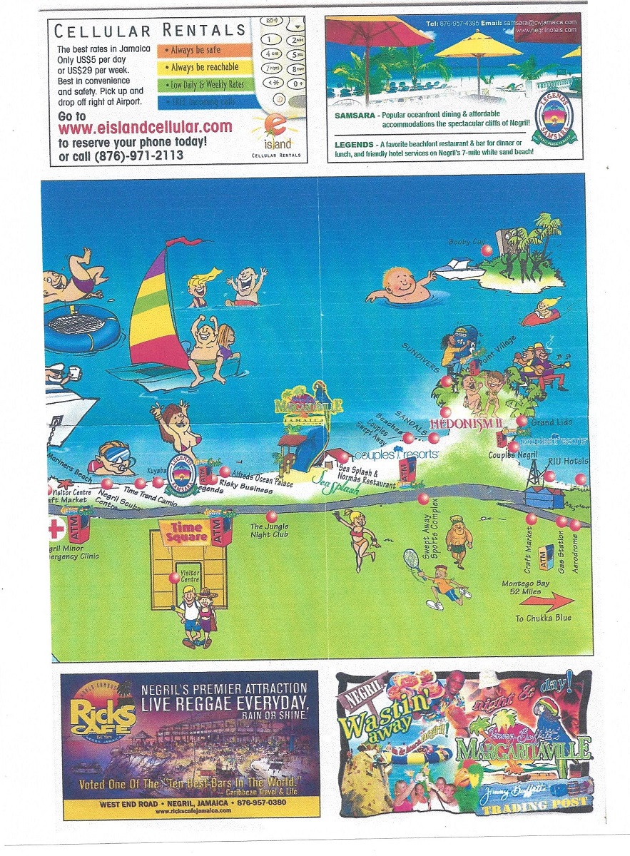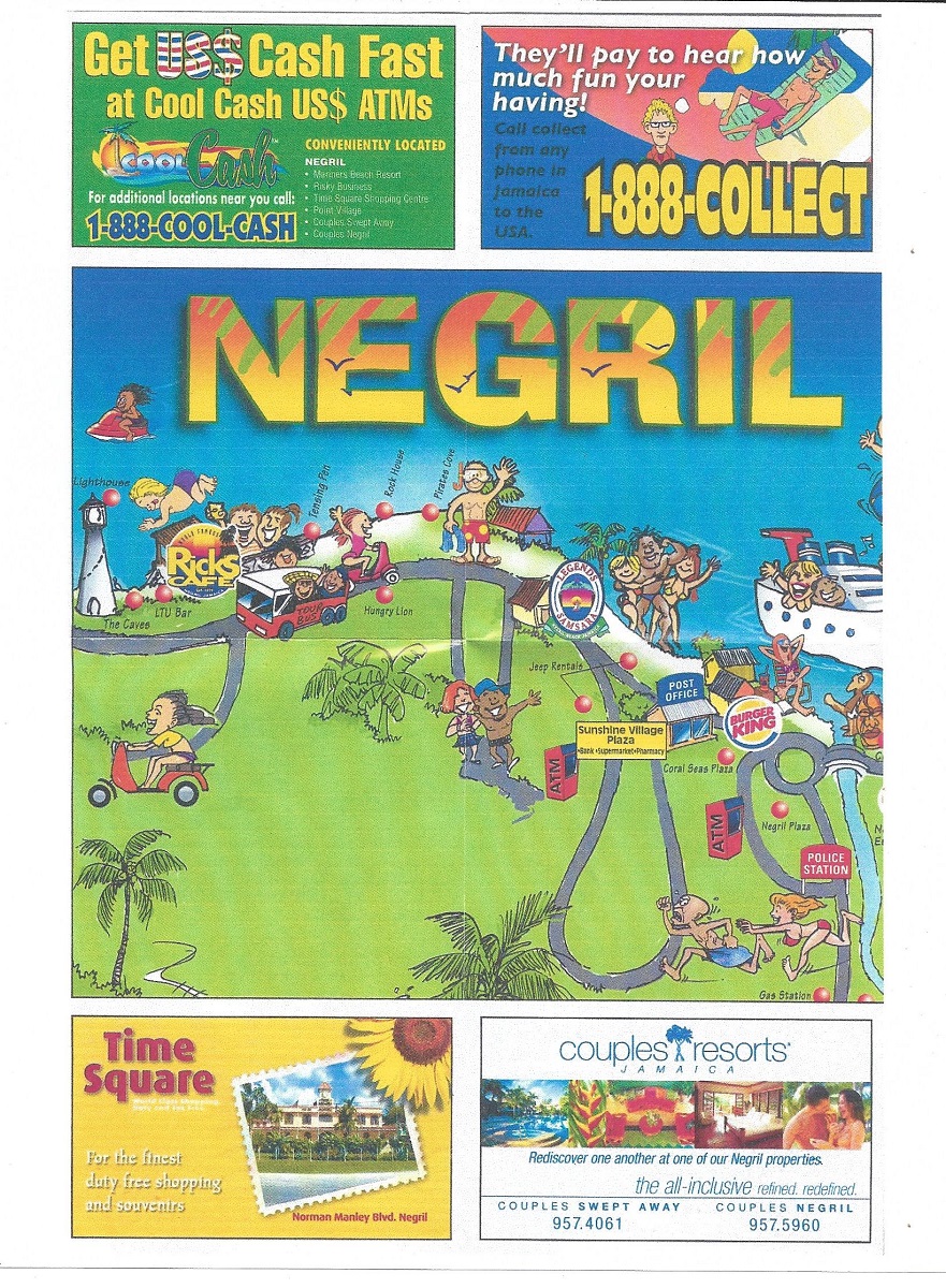 I picked up a brochure in the office with the only map I could find of Negril at the time. I thought you might enjoy seeing it yourself. I particularly like the way they show the interactions between Jamaicans and the tourists. Hope you enjoy.