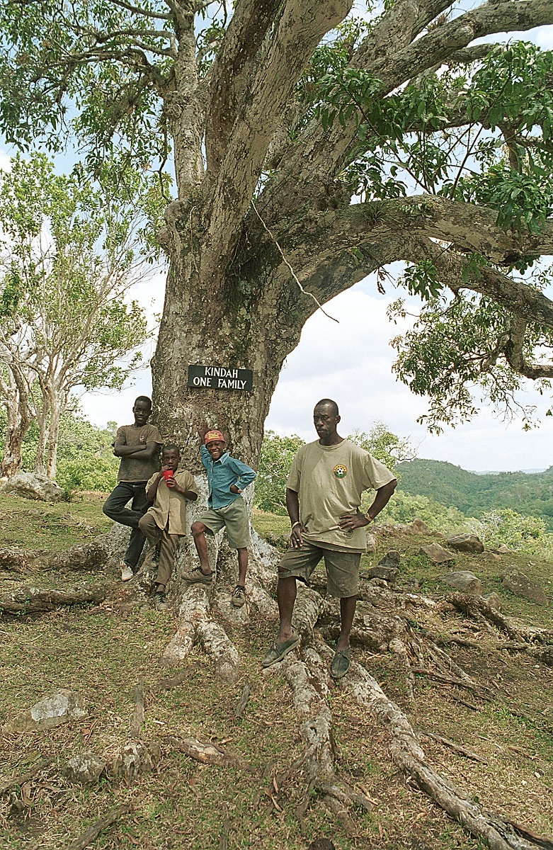 This is a picture of Marshall and some youth under the Kindah "One Family" Tree. This is about a 200 year old mango tree where Cudjoe used to assemble his people and his warriors to plan strategy to defend against the advancing British Army marching up from Balaclava. They could watch them for about 3 days that it took to reach the area. This is called the "One Family" tree because the Maroons were from many tribes in Africa and they had to put aside tribal allegiances to become "One Family" to defeat the British invaders.