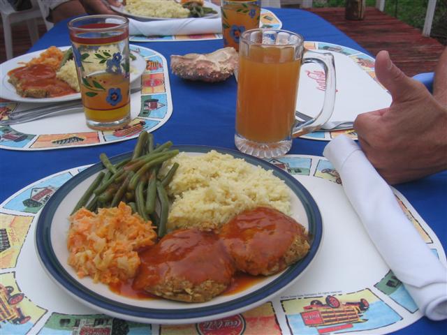 We were staying a Blue Cave Castle (as usual!) so it was a short, but pleasant stroll just after sunset. We were the first guests and staked out a table at the rail along the road. Bentley brought us a couple of cold ones and we kicked back to enjoy the view. Great vista with a wonderful perspective on BCC. I love the ambient neighborfood sounds of Jamaica, especially in a residential area like Bentley's or Wen's just up the way from Out of Town Pastry. Another couple (honeymooners) from BCC joind us at an adjoining table and we all just soaked up the sights, sounds and smells of cooking. This is real home cooking so Bently went to task making everything from scratch. In other words, call ahead or be patient. We drank alot of beers! First the crab back and eventually the cakes. Holy cow! What a feast. I was the onlky one who was pig enough to eat it all. Between courses, a large barn owl flew overhead silently. We all made out way back to BCC and a good nights sleep wit dem belly full.