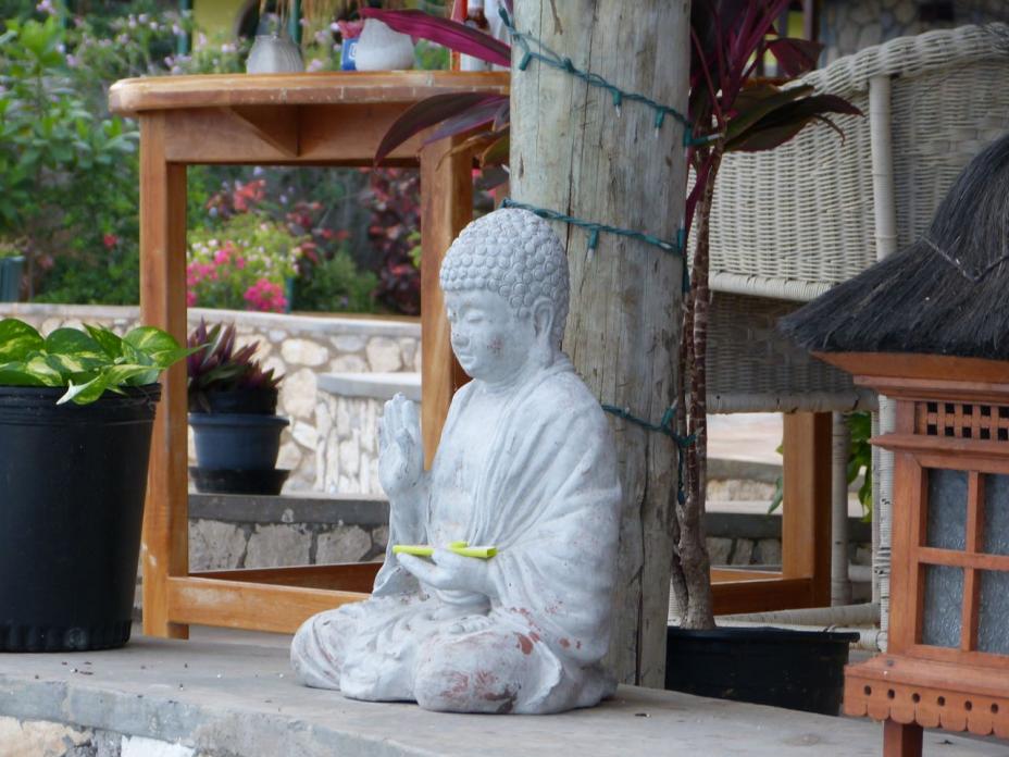 Past the wooden frog planter... by the classic Buddah holding kazoo statue...over the pool bridge...