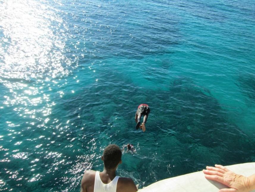 In the photo of the fellow diving....he has one white foot and one black foot. What was that all about?