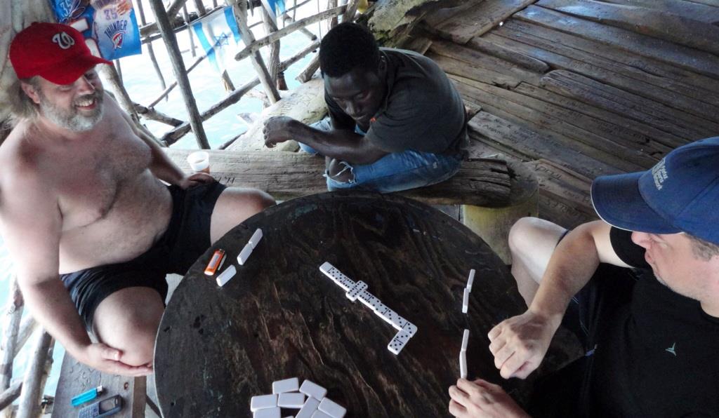 The boats gradually left, and we finally had some room to enjoy ourselves a bit. We all had a few drinks. Most everyone was drinking beer. No regular Red Stripes, which just seemed wrong to me. I'm not a fan of Red Stripe Light. I don't like that the bottles are smaller, they have less alcohol, and cost more than the standard Red Stripes. They also had Heinekins. There was also two half-full bottles of rum, one Appleton and one JB. I ordered an Appleton and Pepsi, and pretty soon started to get in the spirit of things. We took over the dominoes table for a bit, and our boat captain helped us learn the finer points of the game.