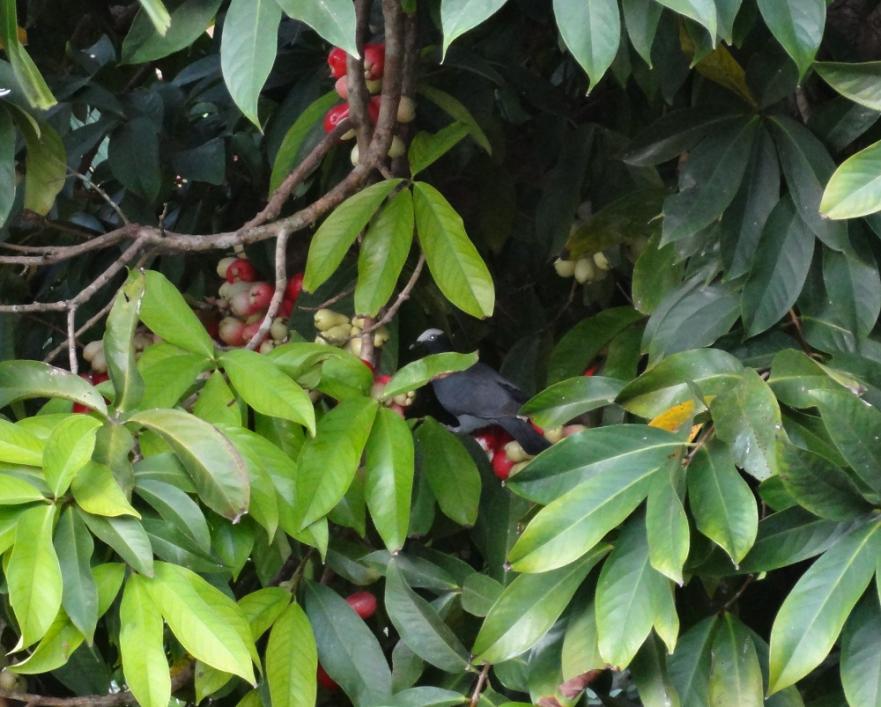 Yesterday afternoon, just before heading out from my room, I heard a ruckus in the Ethiopian apple tree just outside my deck. The tree is bearing fruit now, laden with apples. I looked in the tree and saw the culprit – a Bald Pate. He was in there flapping around and feasting on the ripe apples. Here’s a photo of him: