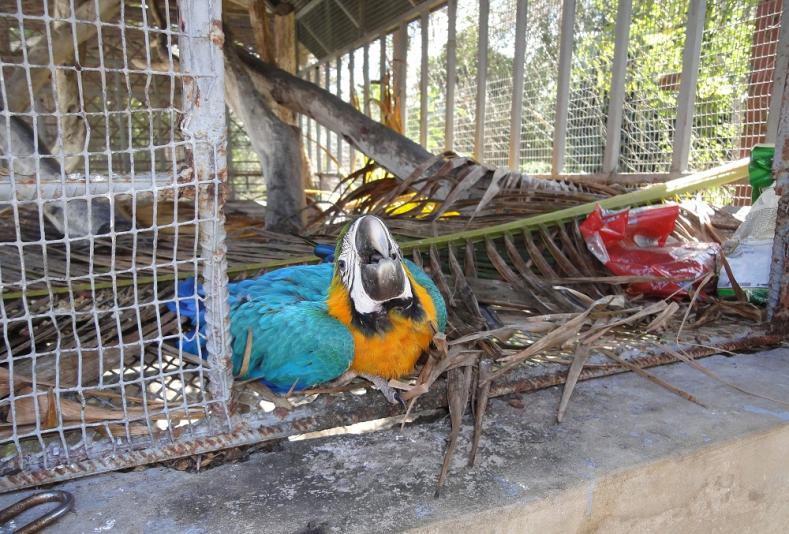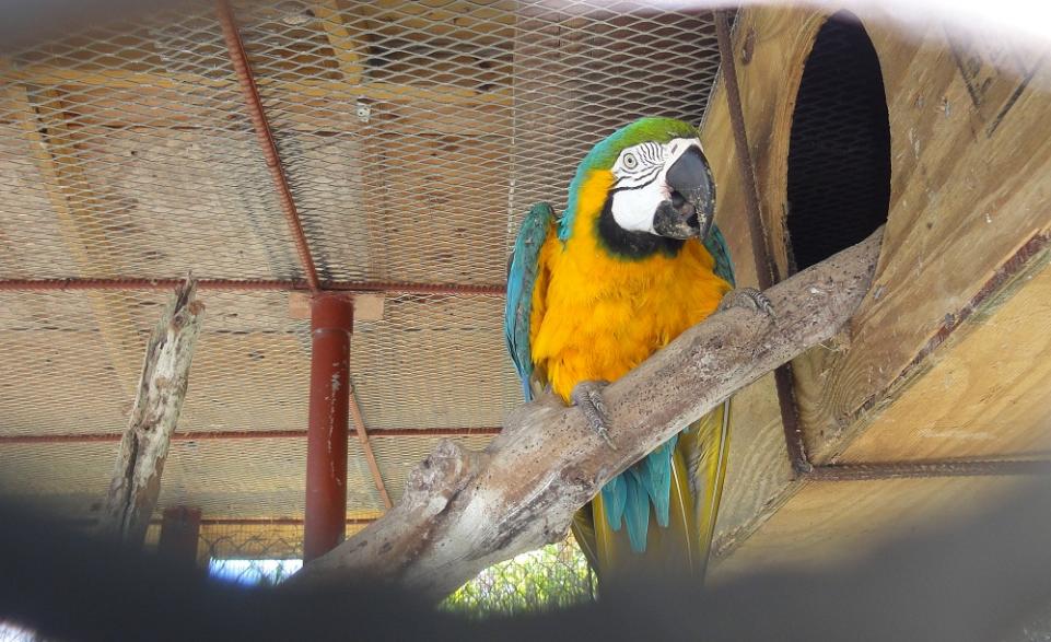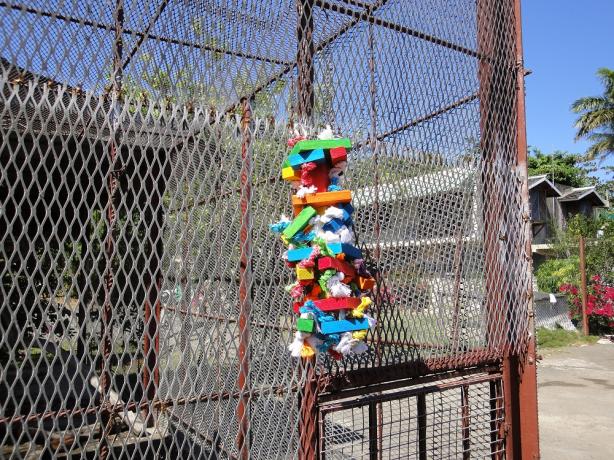 I brought a parrot toy down with me to give to Francis’ pair of breeding macaws, Sinbad and Tiki. I guess I feel a little sorry for them, spending their lives in a cage. So, anyhow, here’s a shot of the toy before it went into the cage and also a shot of Sinbad: